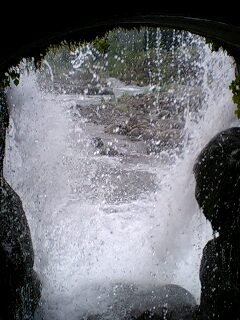 トンネル内は下を水が流れてひんやり、子供たちが描いた絵のギャラリがあるだけ…かと思いきやすっげー爆音(☆o☆) なななんと、さっき見た滝の内側なんですよ!!ヾ(≧∇≦*)ゝ これ実は砂防堰らしくそれでこんなトンネルあるのね…