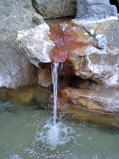 湯口ですが鉄分析出に加え、濃いカルシウムの析出によるいぼいぼと薄いカルシウムの析出による白い粉が共存してるのが興味深いです(・ω・)/
