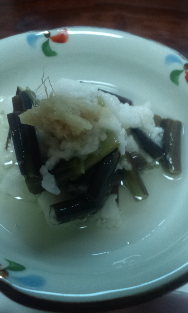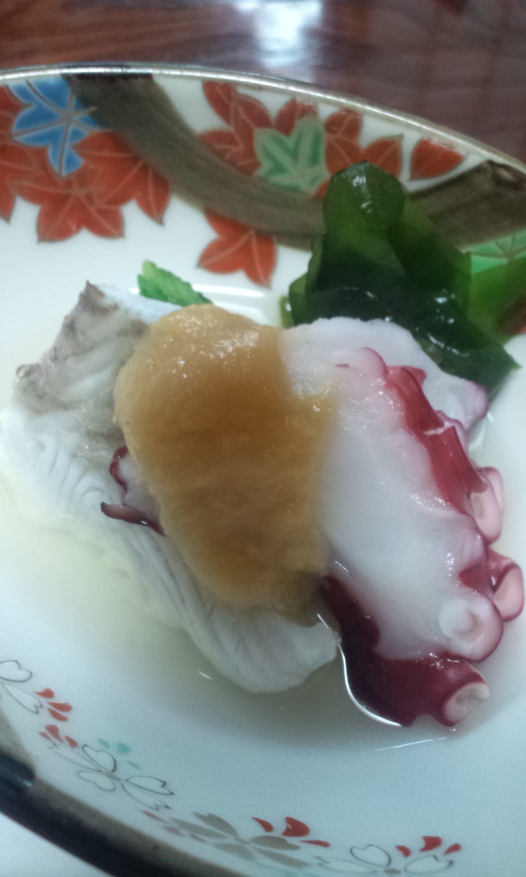 2枚目では蕨餅に薩摩芋?をまぶしたものと、辛子控え目な辛子蓮根、それに柔らかいイイダコ煮が出色。3枚目は蛸と鰤湯引きのぬたで鰤湯引き未体験な食感、4枚目は長芋とずいきの酢の物で精力がつきそうであまりにそのまんまなのがあっぱれ(困)、5枚目は鮃とエンガワと鰤の刺身を孔雀の盛り付けでエンガワがホンモノでアンシンでしたヽ(^○^)ノ