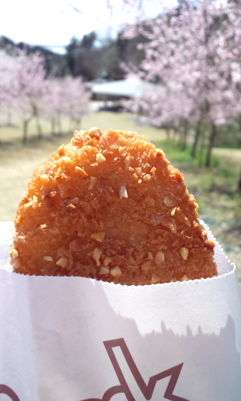 まずは空腹をみたすべく先ほど買ったアーモンドコロッケ150円。へんてつなきかつやたら小さい(^^;コーンコロッケですが衣にクラッシュアーモンド入りで香ばしい(^○^)