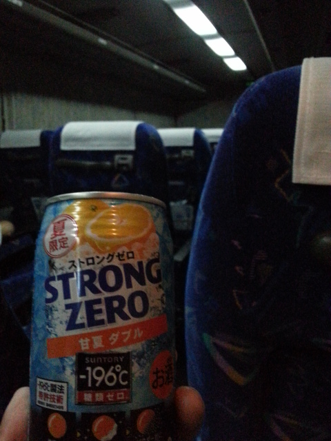 発泡酒空いたんでストロングゼロダブル甘夏に移行しました。これあんまし甘くなくてなかなか( ・∀・)イイ!! ガラガラなんであまり遠慮せずに読書灯付けられるということでしばらく起きてますよ。そういえばドリームさくらんぼ号は走行距離400kmないということで1人乗務なんでした。