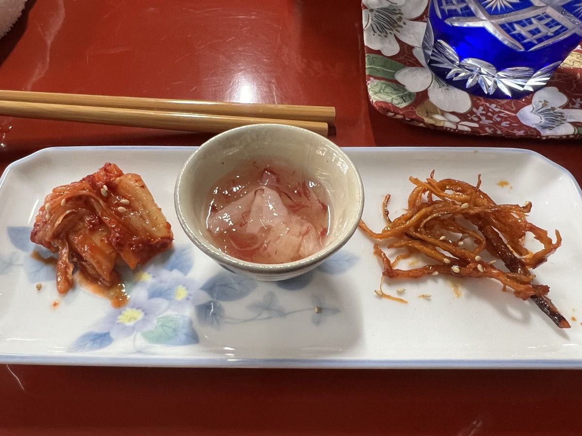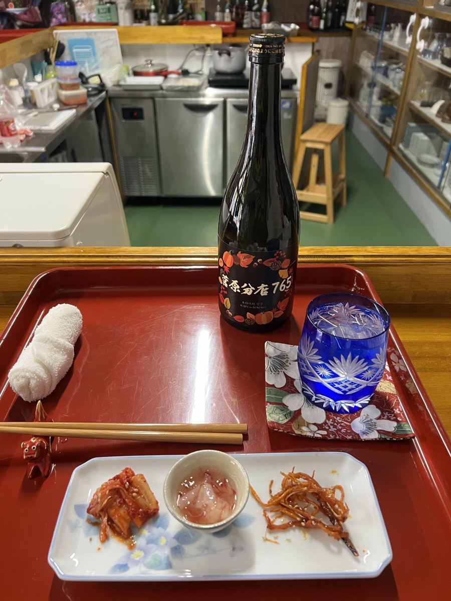 とにかく扇屋すがわらコンボで脱水しまくったので芋焼酎炭酸割り!( ^ ^ )/□ ちょうど良い濃ゆさと微炭酸!(^○^) お通しはキムチ(酸っぱくて私好み)、さきいかチャンジャ(旨味×旨味)、そしてアブラナ科の根と思いましたがなんと姫竹!(OvO) の梅酢和え! これは(・∀・)ンマイ!!