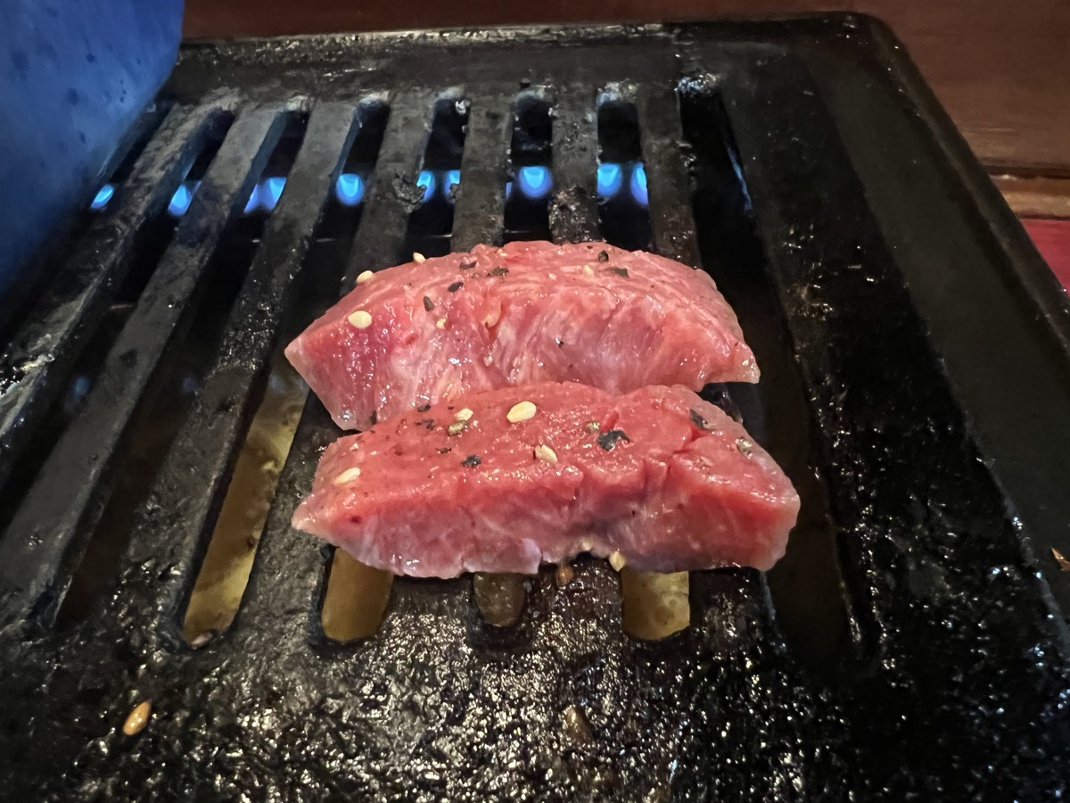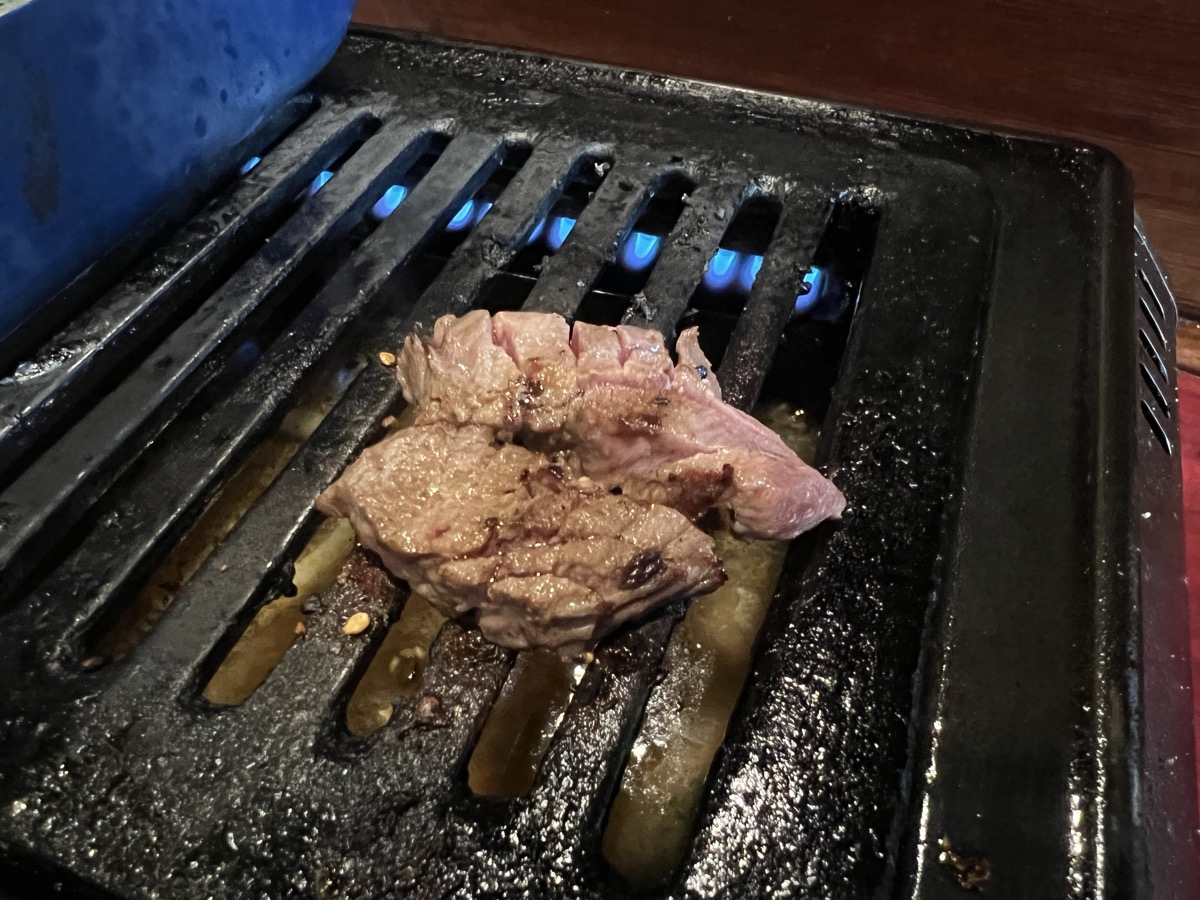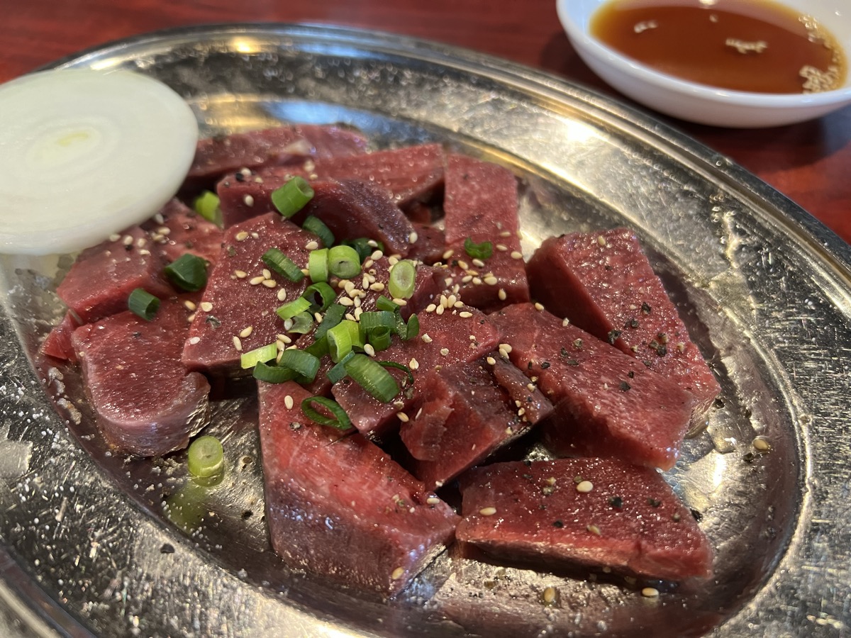 牛タンの先端は硬さのため通例ではシチューにする部位ですが常連向けに焼で提供していただけます(在庫あれば)。そして今日は最大に丁寧かつ深い包丁入れでふつうの噛み噛みで食べられた!ヽ(´▽`)/ 味はふつうに牛タンなのでホントええわ?(^^)v