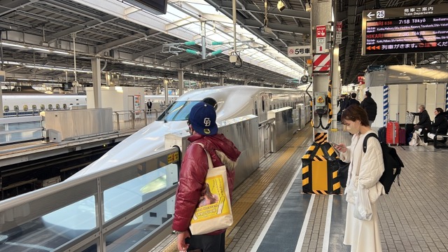 終点新大阪駅の乗換改札で選択乗車を申告、スムーズに新幹線特定特急券(e特急券)にスタンパーもらい、大阪近郊区間最長O型大回り3経路め東海道新幹線、始発ひかり638号東京行きに乗車