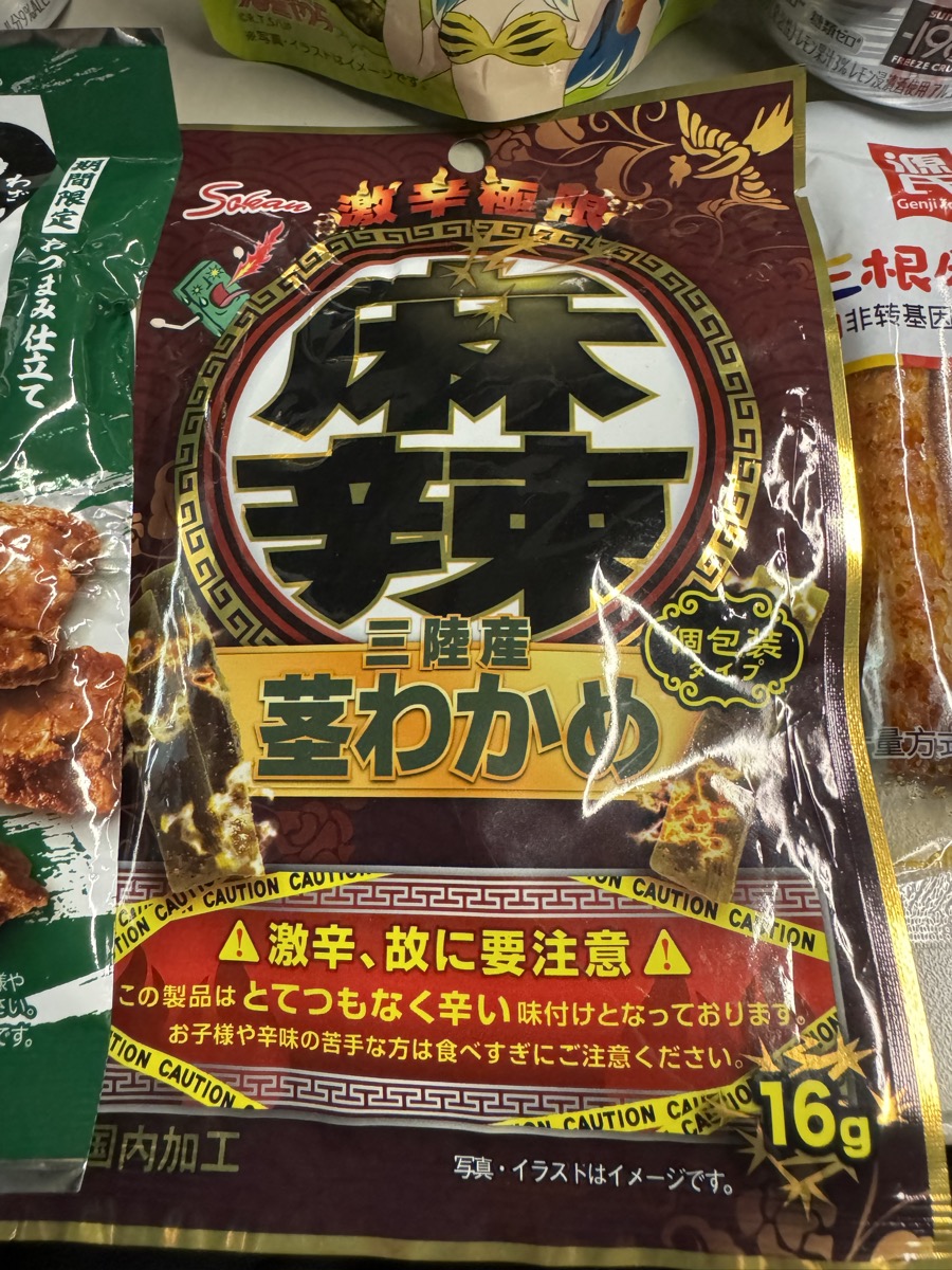 まず麻辣三陸産茎わかめ。あまりにおどろおどろしい注意書きがありますが…よく読むと「苦手や子でも少しは食べられる」となってるじゃん!( ̄◇ ̄;) 辛味は表面だけだとCoCo壱3辛くらいのピリ辛下限ギリありますがシビレはまぁかろうじてありますねレベル。これで麻辣名乗るって端的に誇大表示では… 次に、パートナーの謝さんの旧正月お土産、源氏の三根麻辣。これはすごかった! なによりもこれ、旨味のある澱粉シートを巻いてあって、ひとくちでは噛み切れなくて、噛むとしっかり麻辣が味わえるというやつ!(*≧∀≦*) 辛さはピリ辛上限、シビレもガチレベルで激旨でした!! そして、唐辛子版もちゃんと辛かった、技のこだ割り 鬼辛わさび味。完全にガチの硫化アリルで速攻で涙目&鼻水レベル!(((o(*゚▽゚*)o))) いやーこういうのを求めてるんだよこういうパッケージ表記にはさ!!(*゚▽゚*) 塩味も甘味も刺激とのバランスが計算され尽くしててすばらしい! さすが亀田!!\(^ω^)/ 最後に、先週末買ったけど開けなかった、じゃがりこ 辛いやつ わさび醤油味。…まぁじゃがりこだからね…まったく辛くないし硫化アリルによる刺激もない…わさびっぽい味はあるけどさ……亀田製菓を、カルビーは見習って欲しい!! というわけで25分間、ストゼロは500mlくらい呑んで、ひとまずごちそうさま( ^_^)/~
