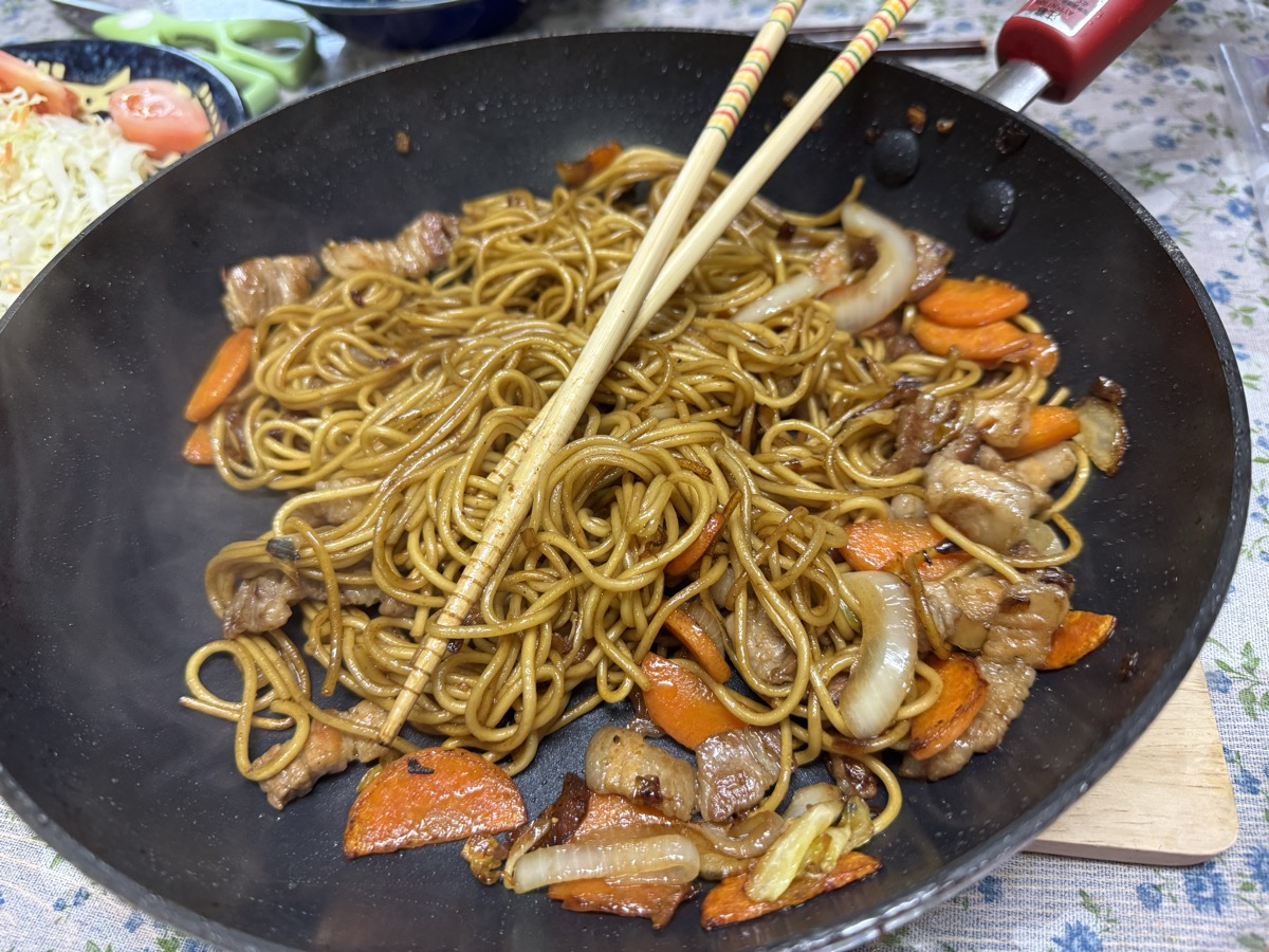 おはようございます。昨晩は玖伊屋会場で参加者のほぼトップを切って22時に寝てしまい(^◇^;)、8時間半睡眠で起床、シャワーお借りしてまったりしてからのあさごはん!(今朝は呑まない!) サラダに徳島の鬼スコたっぷり、そして業スー中華麺の香ばしいできたて焼きそばでがっつり。