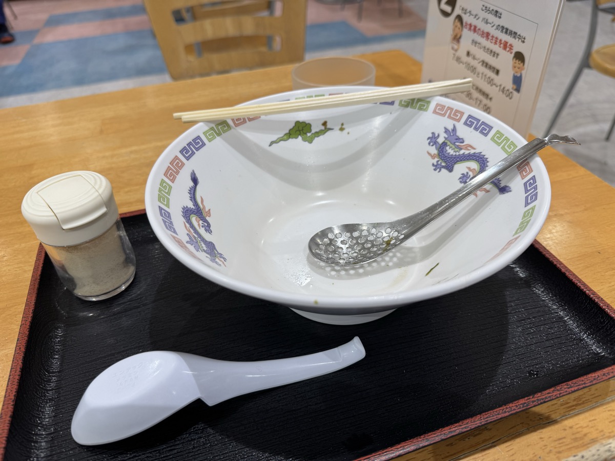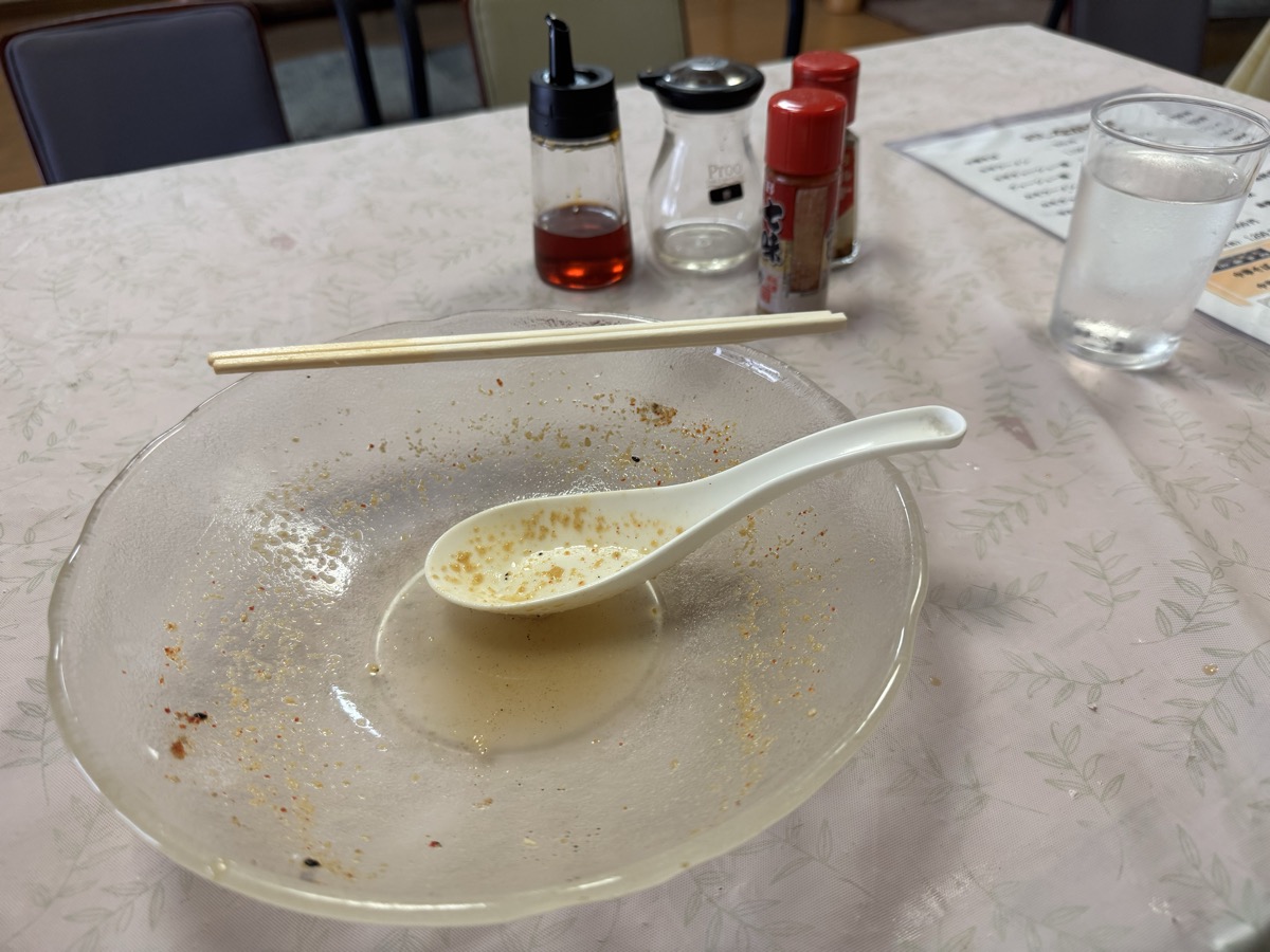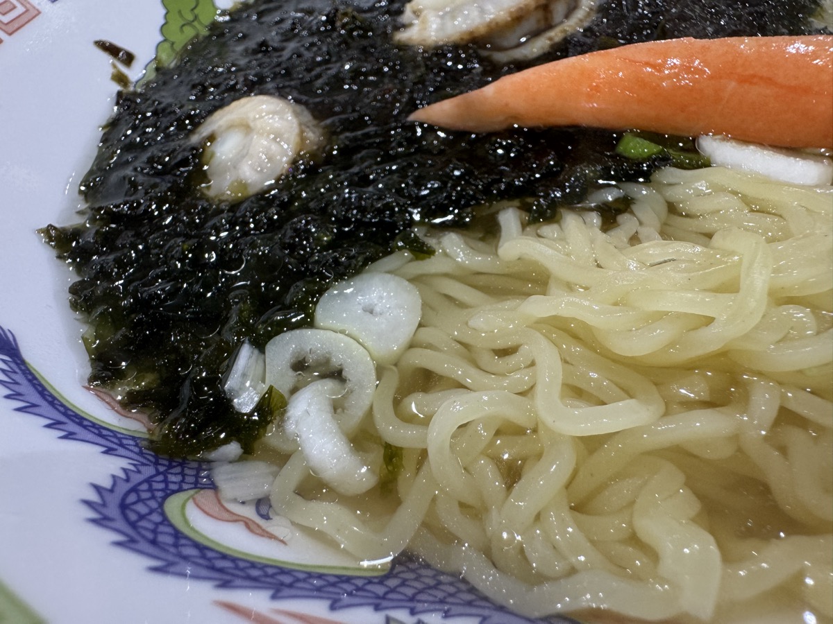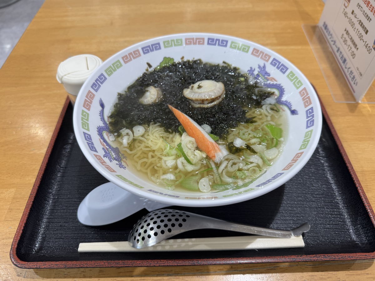 ホタテ2粒とカニカマも乗ってる細縮れ麺の塩ラーメンです。いやもう最初のすすりで磯の香りと風味が大爆発(((o(*゚▽゚*)o))) かなり人を選ぶラーメンですヽ(´▽`)/ テーブル白胡椒でかなり落ち着くのでそれも(・∀・)アリ!! 出汁は完全に海鮮、200円ぶんの三陸磯のりももちろん香り風味つよっつよ(^^)v 8分弱完食完飲のごちそうさま!( ^_^)/~