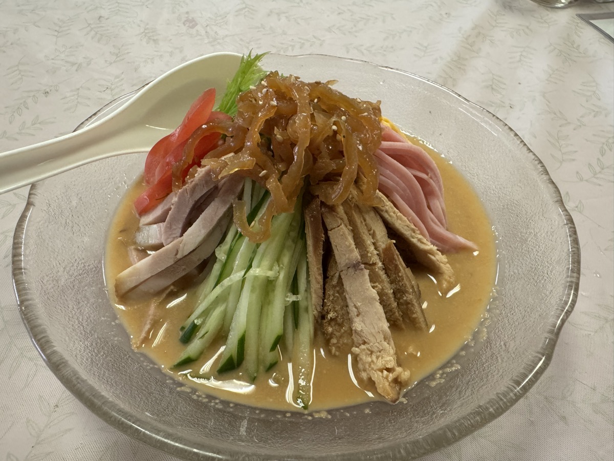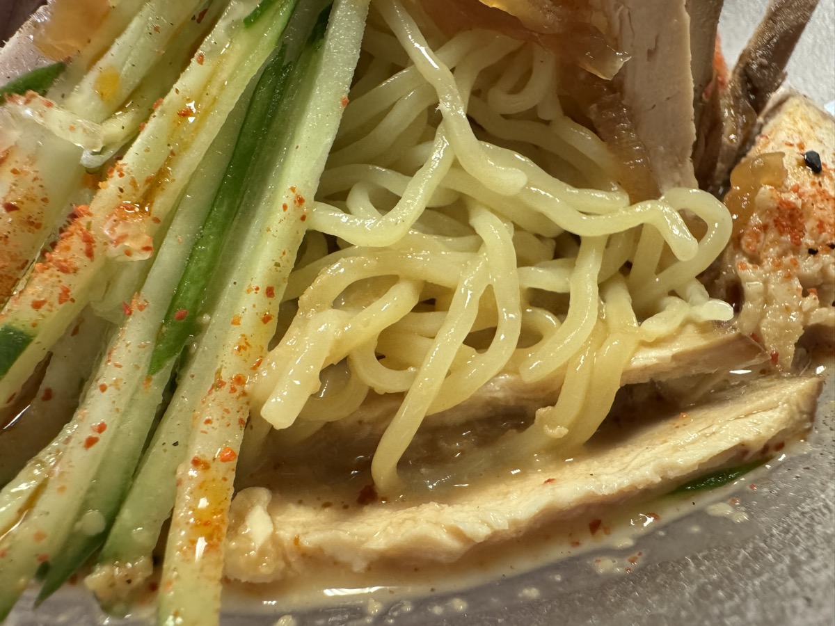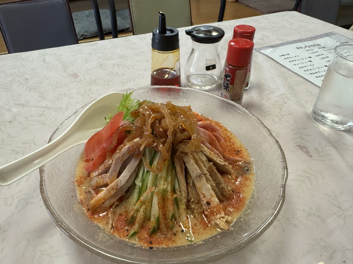 塩味酸味強めの ごまだれ が多加水縮れ麺にめっちゃ(・∀・)アウ!! 具材も焼豚ハム胡瓜くらげトマト水菜とたっぷり、辣油酢七味テーブルコショーで味変も自在、こりゃ飲み干しまっせ!な6分完食完飲ごちそうさま!( ^_^)/~