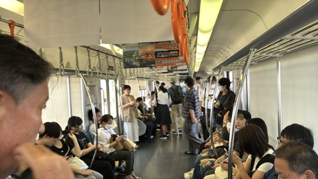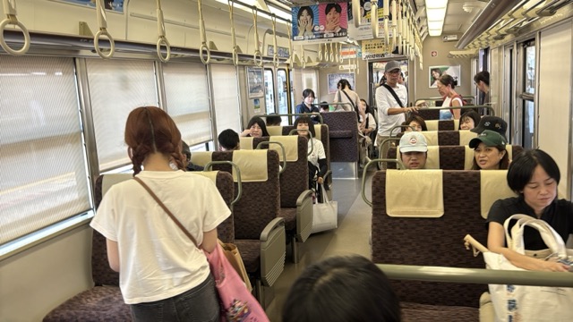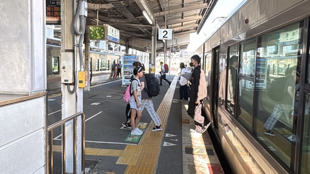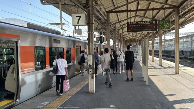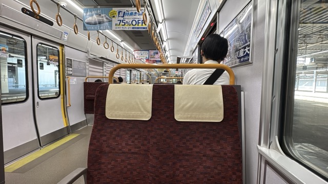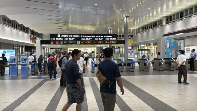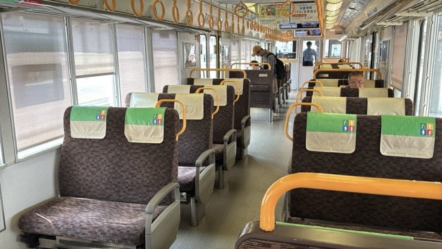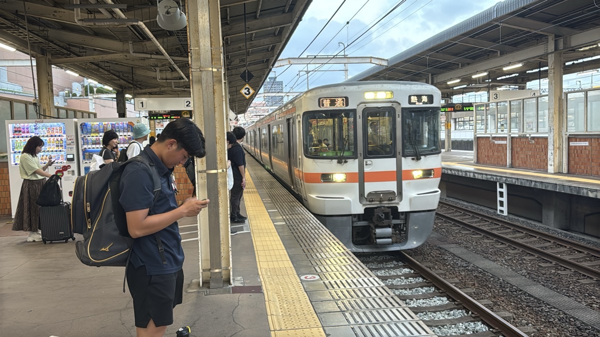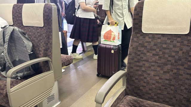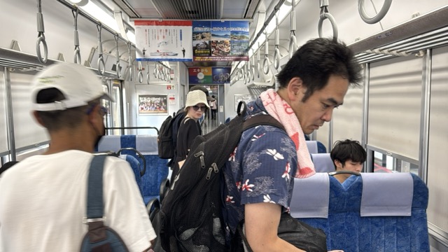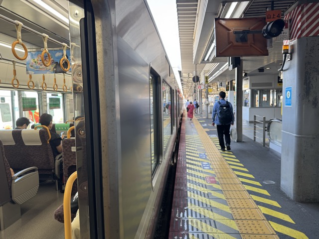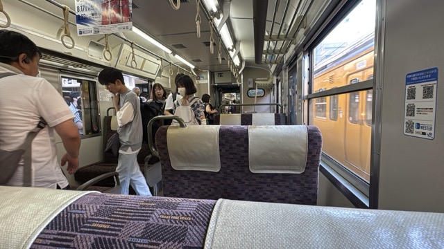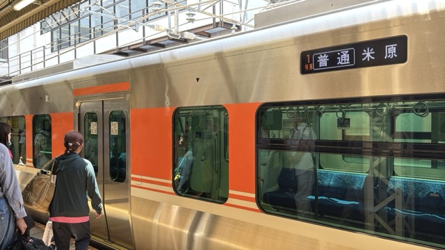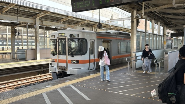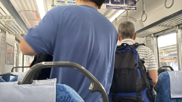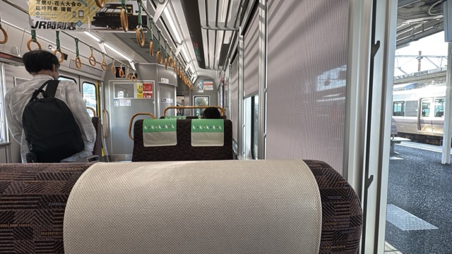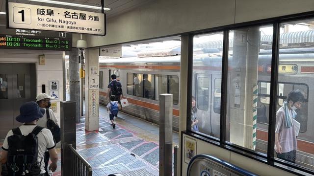 去年春から同一ホームに改善されましてホントありがたく。そして新快速は名古屋駅での2分間停車のドアー開で蒸し風呂のような暑さに、もうおかしいぞ気候…(月並み)。元気なくちとうとうとしました。こちらは混んでて通路側相席。