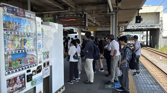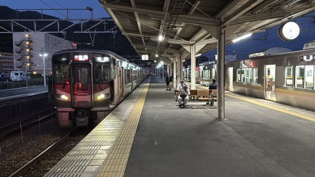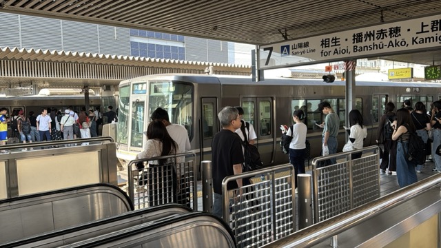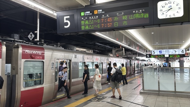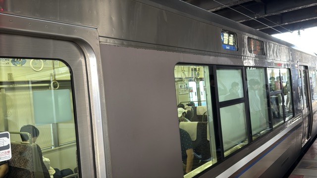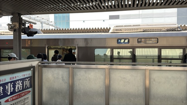 京都まではこの始発快速網干行きが先行するがそこから先は野洲で始発新快速に乗り換えてほしい、と駅構内放送ありました。そして並んだ列の先頭の人がドアーボタン知らず、最後尾の私は隣の列の最後尾に移動して、なお無事通路側相席ですが着座(^^)v