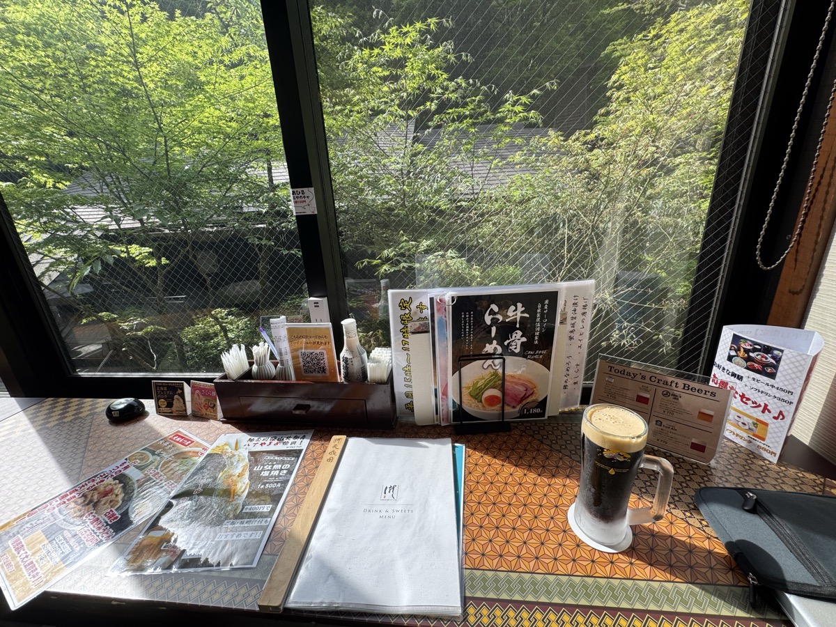 この窓向かって右奥の見えないところにある玉簾(たまだれ)の滝の上流の水で仕込んだ芋麦米があるそうです。エステル感じますがそれでも軽くて甘くて飲みやすい(^○^)