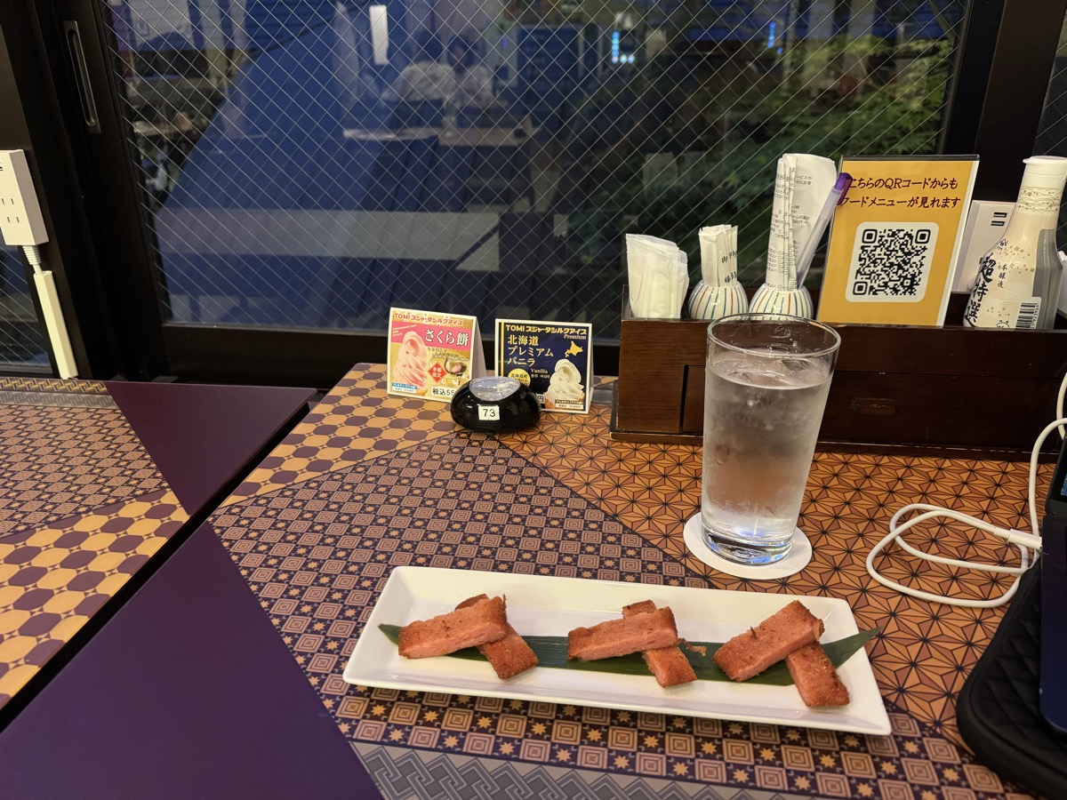 箱根湯本温泉天成園憩い処、ほぼ日も暮れましたがそのまま玉簾の滝芋水割りおかわり( ^ ^ )/□ とともに赤天600円