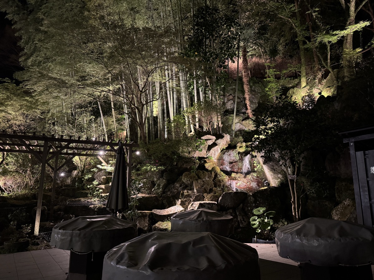 箱根湯本温泉天成園の日帰り入浴客はてんせいまーとで買ったものを館外でしか飲食できないらしく、ならばと23時まで開放されてるライトアップ庭園に来まして、