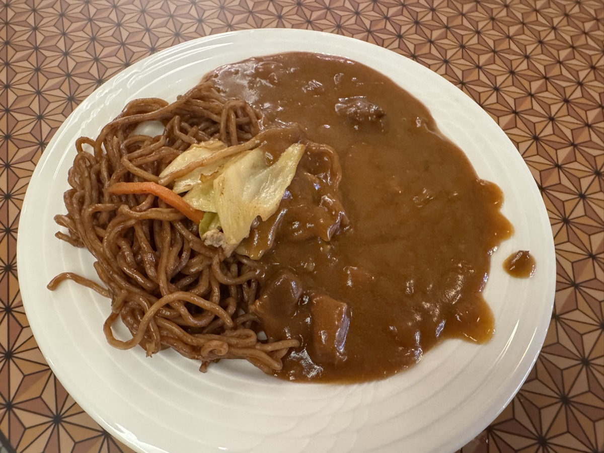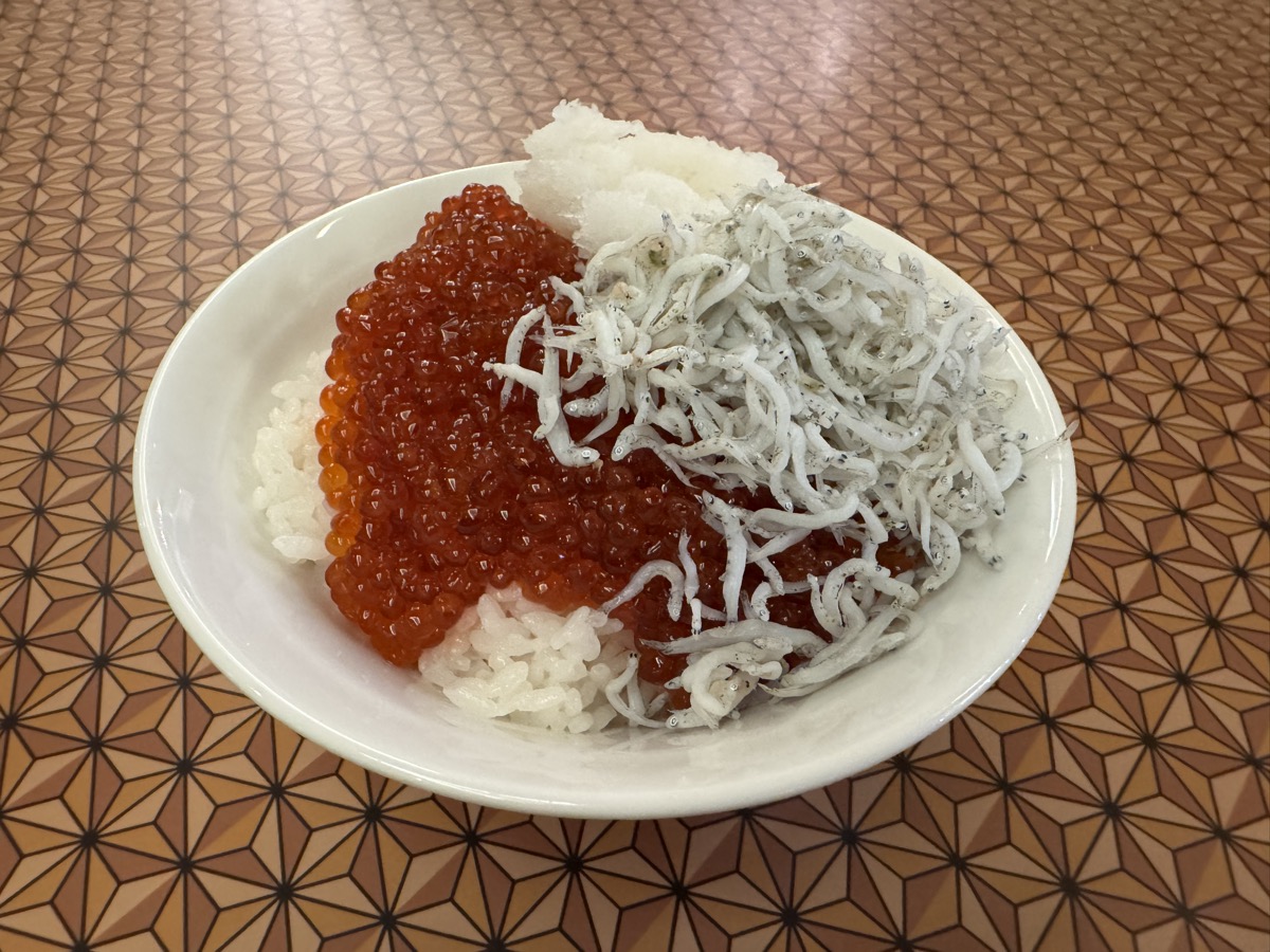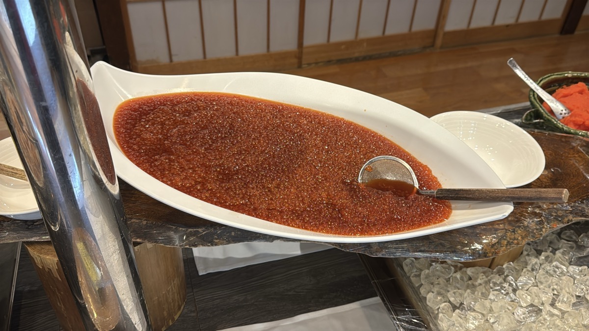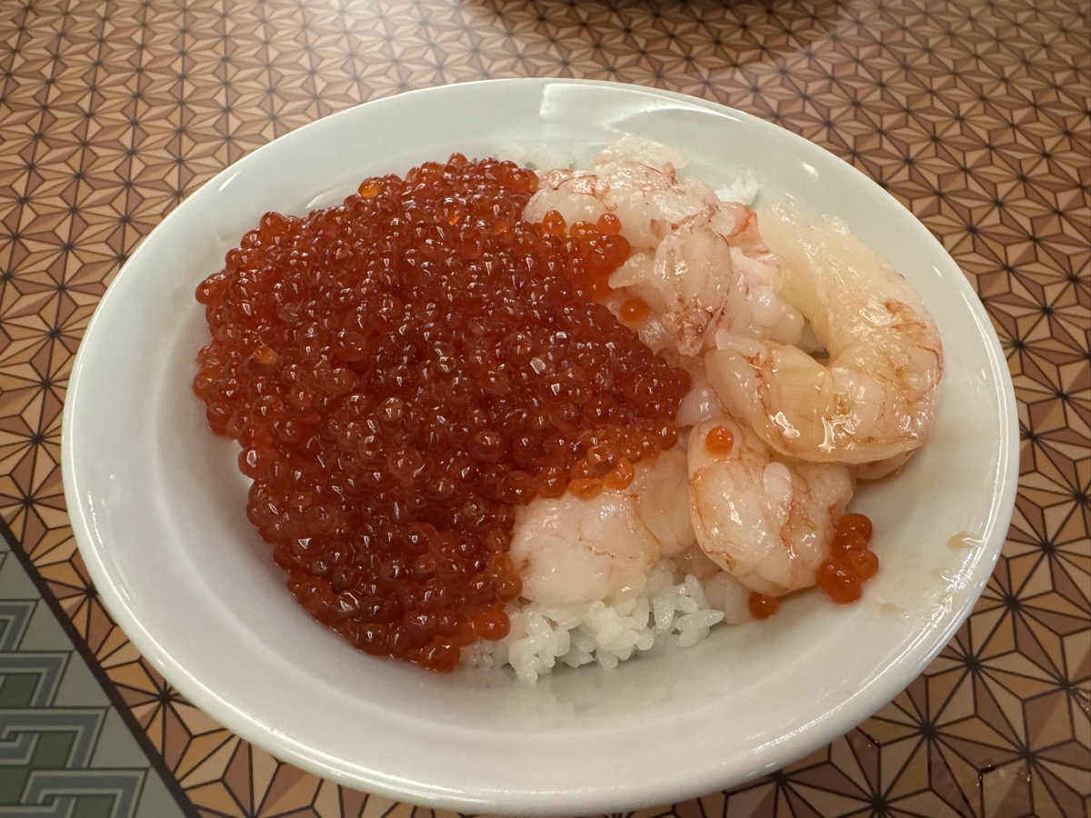 箱根湯本温泉天成園朝食バイキング第4周めはジェネリック焼きそばにホテルカレー掛けという最高にあたまわるいお皿、そして第5周で食事の〆、イクラ赤海老丼ご飯150g