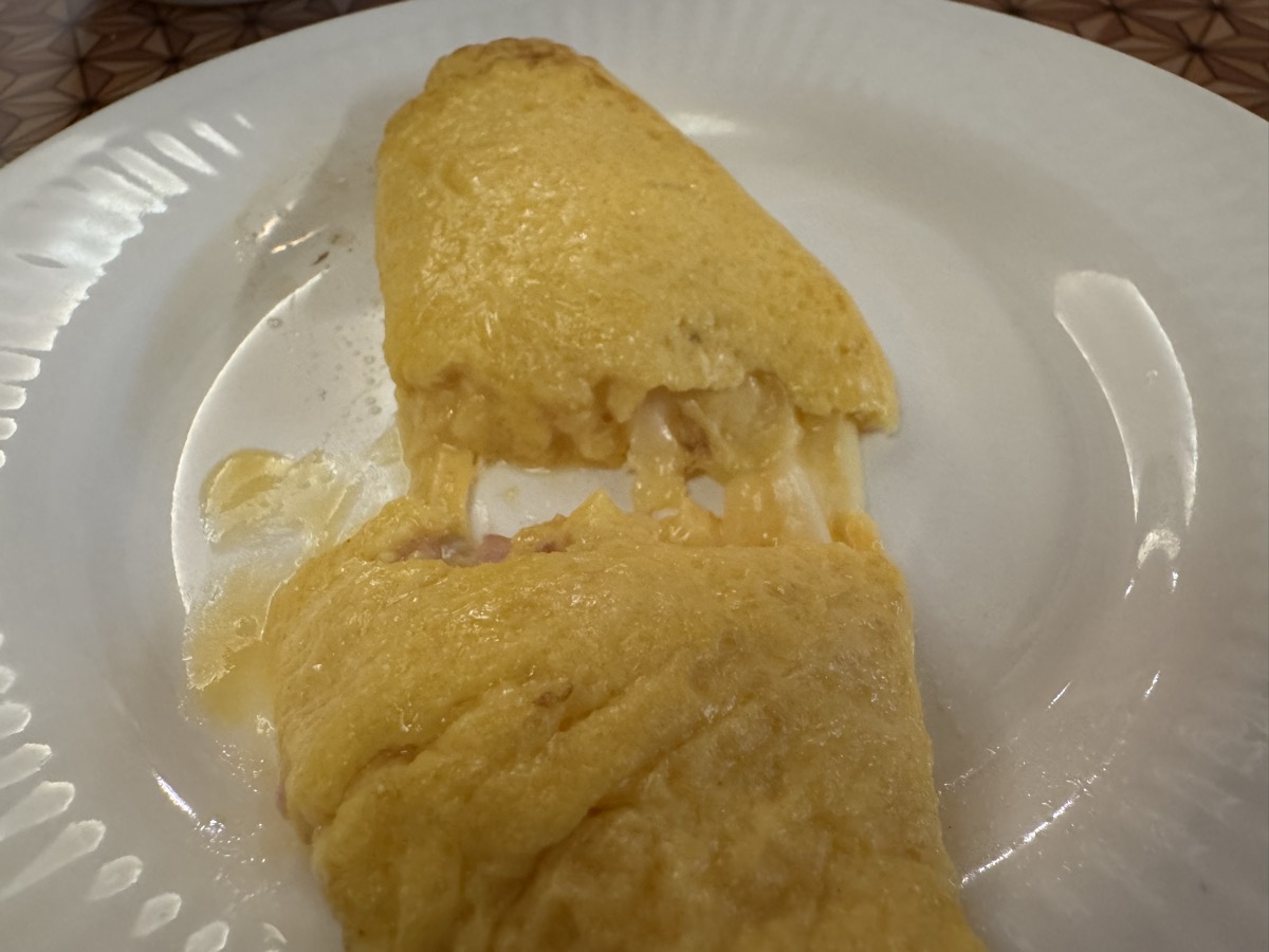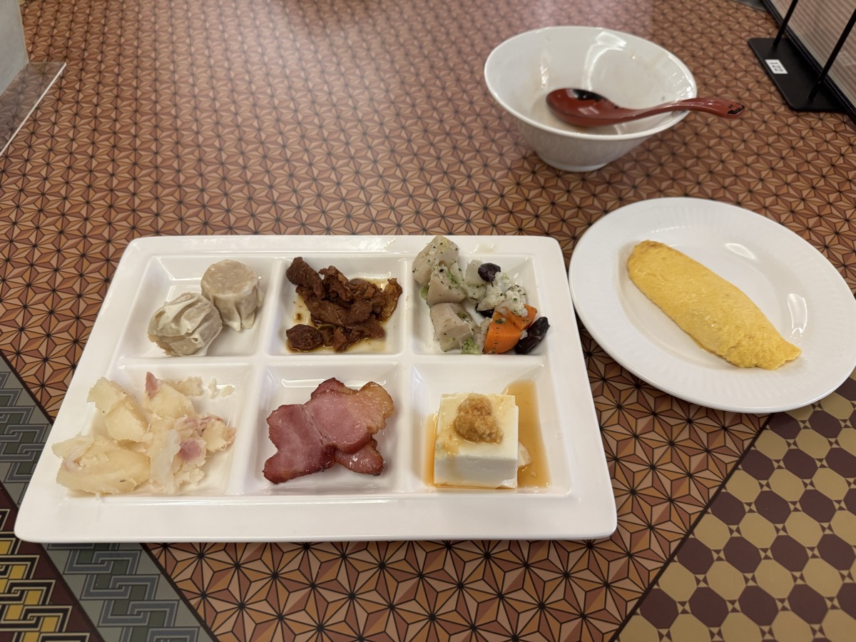 箱根湯本温泉天成園朝食バイキング、ライブキッチンのオムレツ、彩り温野菜、本日の魚角煮、焼売、ジャーマンポテト、厚切りベーコン、玉簾の滝の上流の水で仕込んだ玉簾豆腐