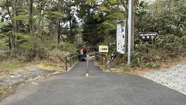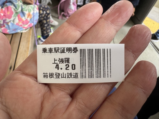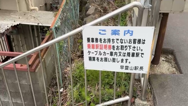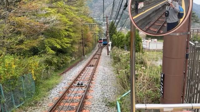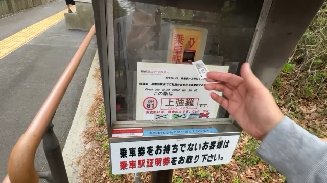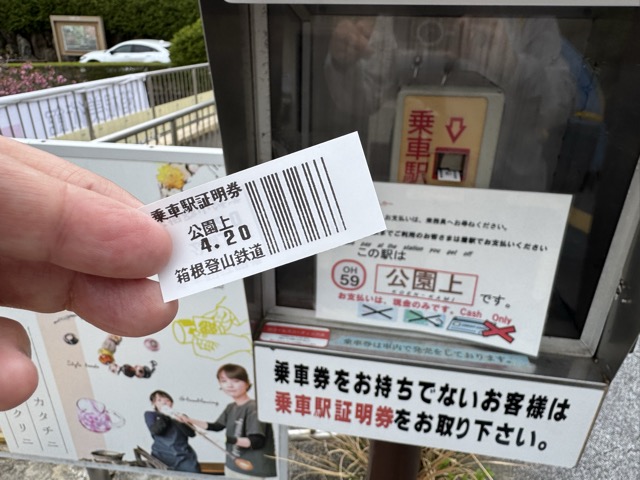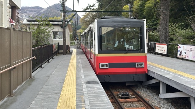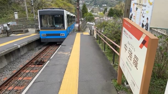 中強羅駅からほぼ線路沿いに徒歩300mの公園上(こうえんかみ)駅より乗車駅証明券取って箱根登山ケーブルカー各停強羅行きに乗車