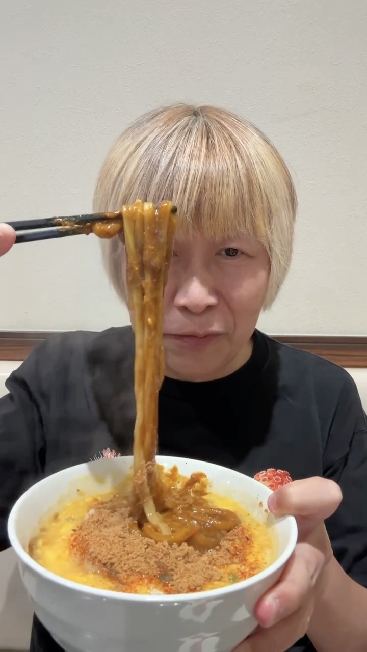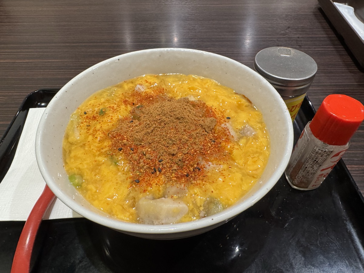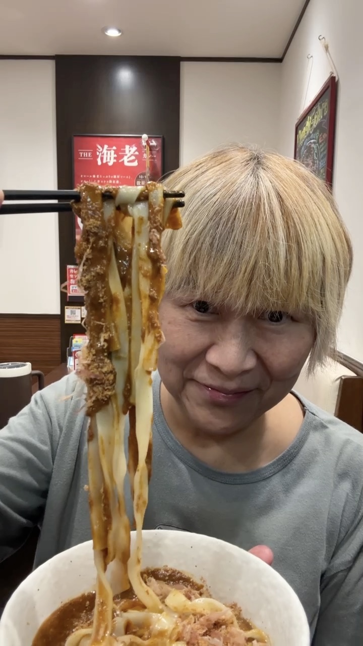 豚小間肉ゴロゴロのあんは1cm厚くらいあって、20辛+とび辛スパイスがだいぶん低減されます(笑)が美味しい♪ タピオカうどん麺もネバリゴシ良くってするすると食べられますヽ(´▽`)/ 4分半完食完飲、いやこの粘度で完「飲」なのだろうか(笑)、ごちそうさまでした!( ^_^)/~