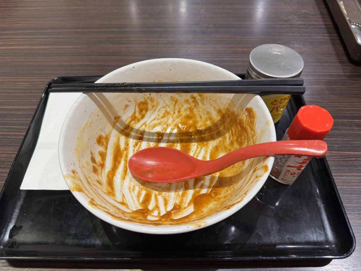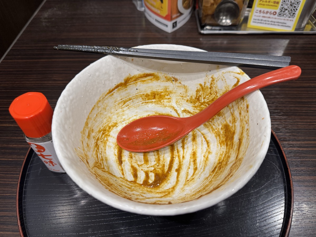「ころ」は名古屋めしで「冷しうどん」のこと、CoCo壱のきしめんは生地厚めで弾力もあり、これが冷たい麺で冷たい20辛カレーソースと合いまくる!(((o(*゚▽゚*)o))) 辛さは冷たいぶんやや少なく感じますが喉はいつも通りに痛いヽ(´▽`)/ 2分強完食完飲(飲?)ごちそうさまでした( ^_^)/~