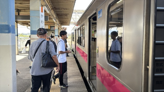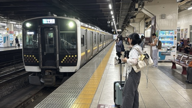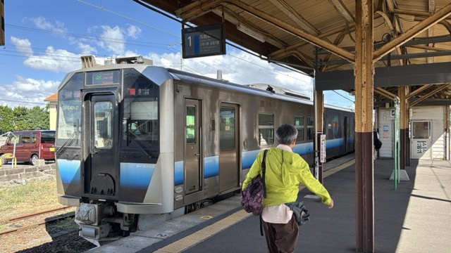 東武の下今市駅から小雨の中800m歩いてきてのJR今市駅に今日まで有効の大人の休日倶楽部パスで入場、跨線橋わたってなぜか2分遅延の普通宇都宮行きに乗車