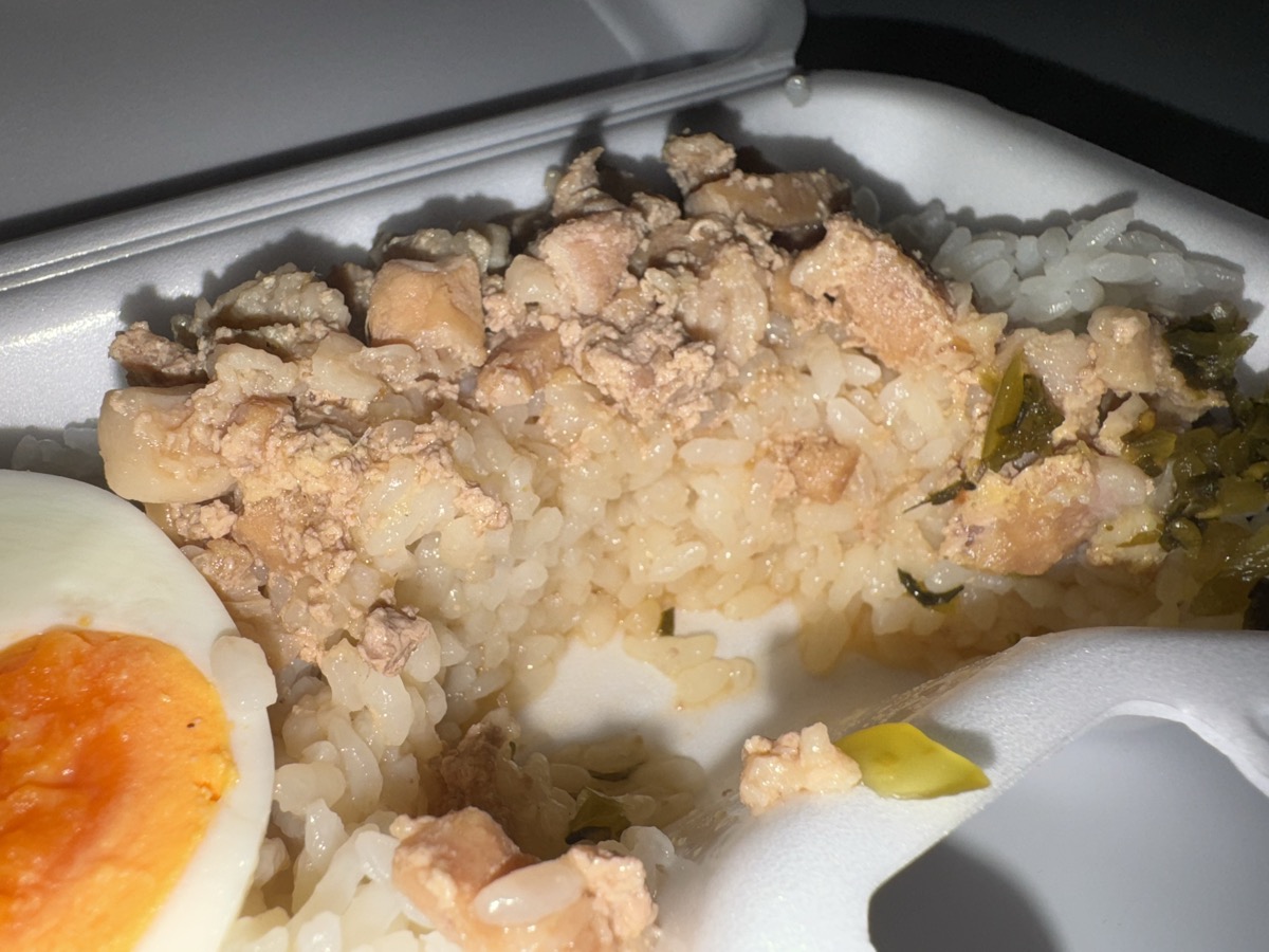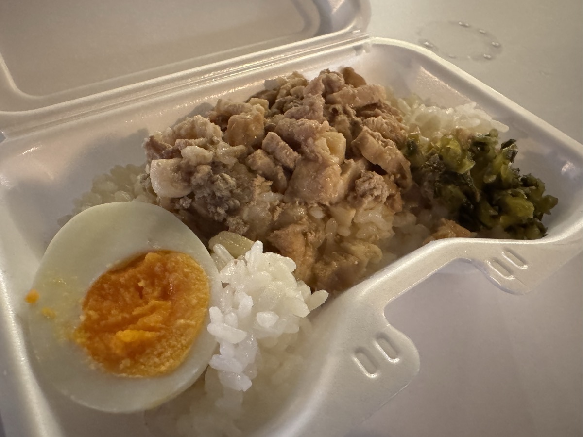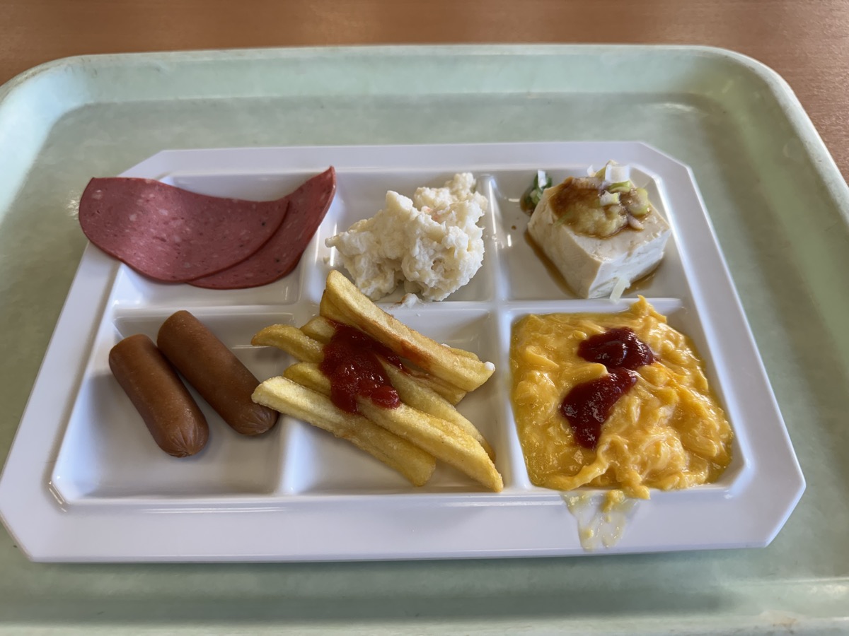 で全メニューは後日公開の動画に譲り(^◇^;)、第1弾はそれらから洋&サラダ系チョイス、ソフトサラミ、ポテトサラダ、冷奴、ウインナー、ポテトフライ、スクランブルエッグ。冷奴が美味しい♪。そしてポット入りのウインナーと卵がお玉挟んでて冷めてる(笑)