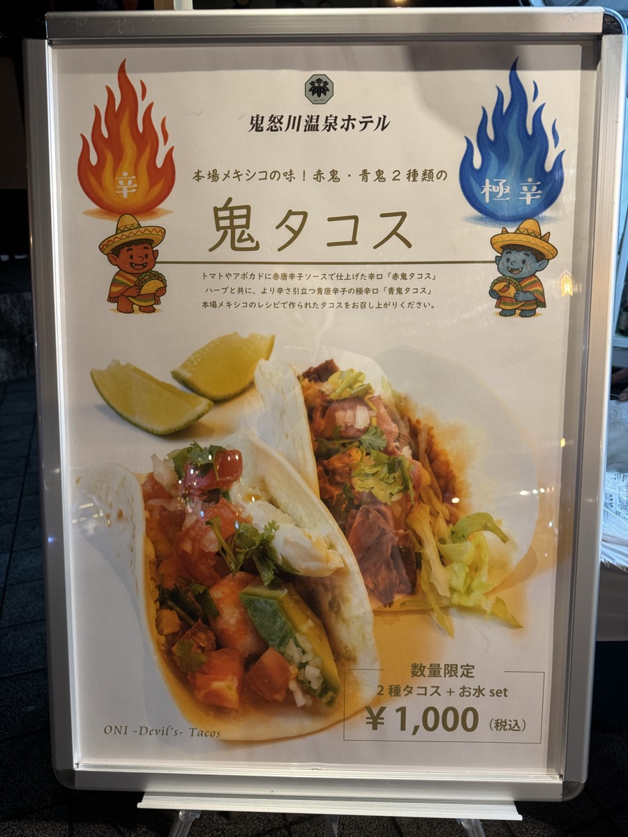 鬼怒川温泉鬼のごちそうで鬼怒川観光ホテルの出店、鬼タコス 水付き1000円!