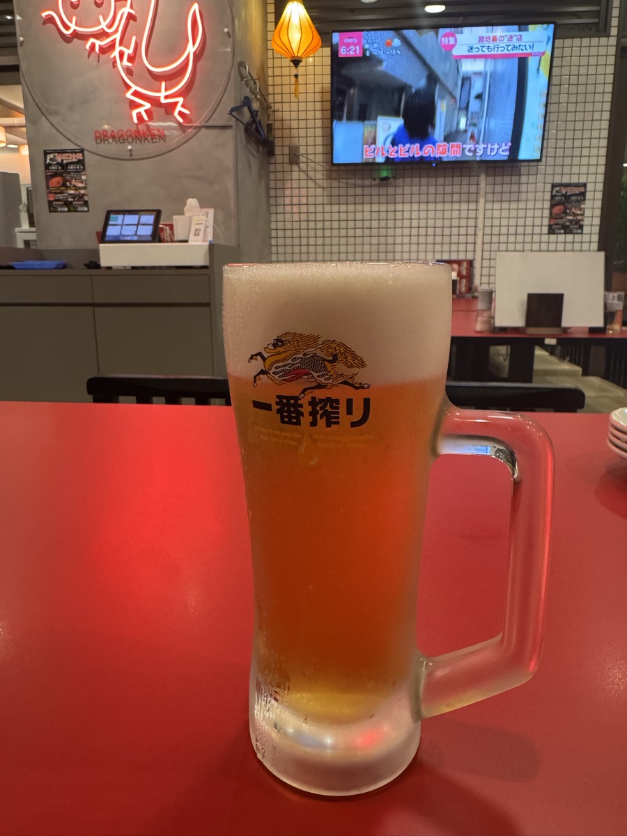 鬼怒川温泉鬼のごちそう、満卓のためテーブル相席をお願いしm(_ _)m、おとといも生買った健ちゃんちで生ビール600円( ^ ^ )/■と待って焼き立ての焼きモツ500円!!