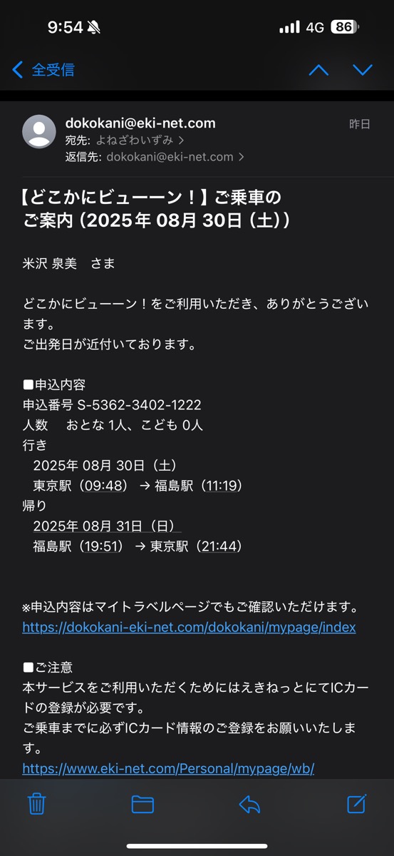 福島駅からはどこかにビューーン!の復路利用(笑)、新幹線やまびこ220号東京行き普通車指定席に乗車