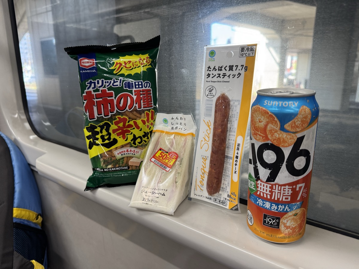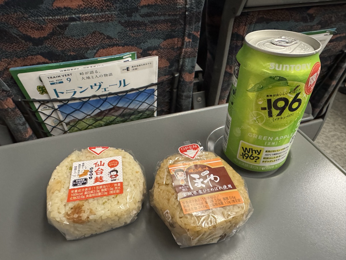 仙台駅から東北新幹線やまびこ163号盛岡行き普通車自由席に乗車して、NewDaysで仕込んだのの全面展開ヽ(´▽`)/