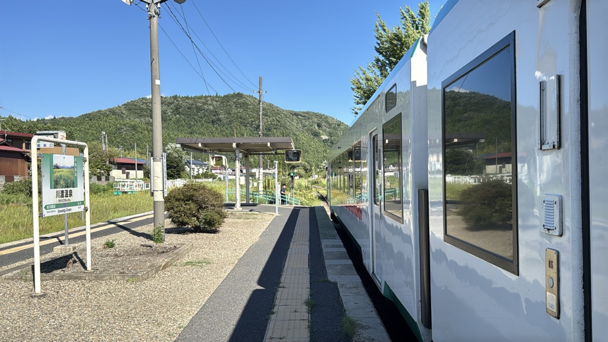 川渡温泉駅で予備の運転士さんに惜しげもなく途中下車印入りの3分割乗車券の2・3枚めをお渡しして下車