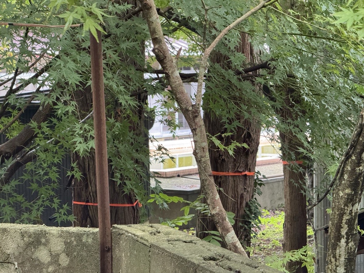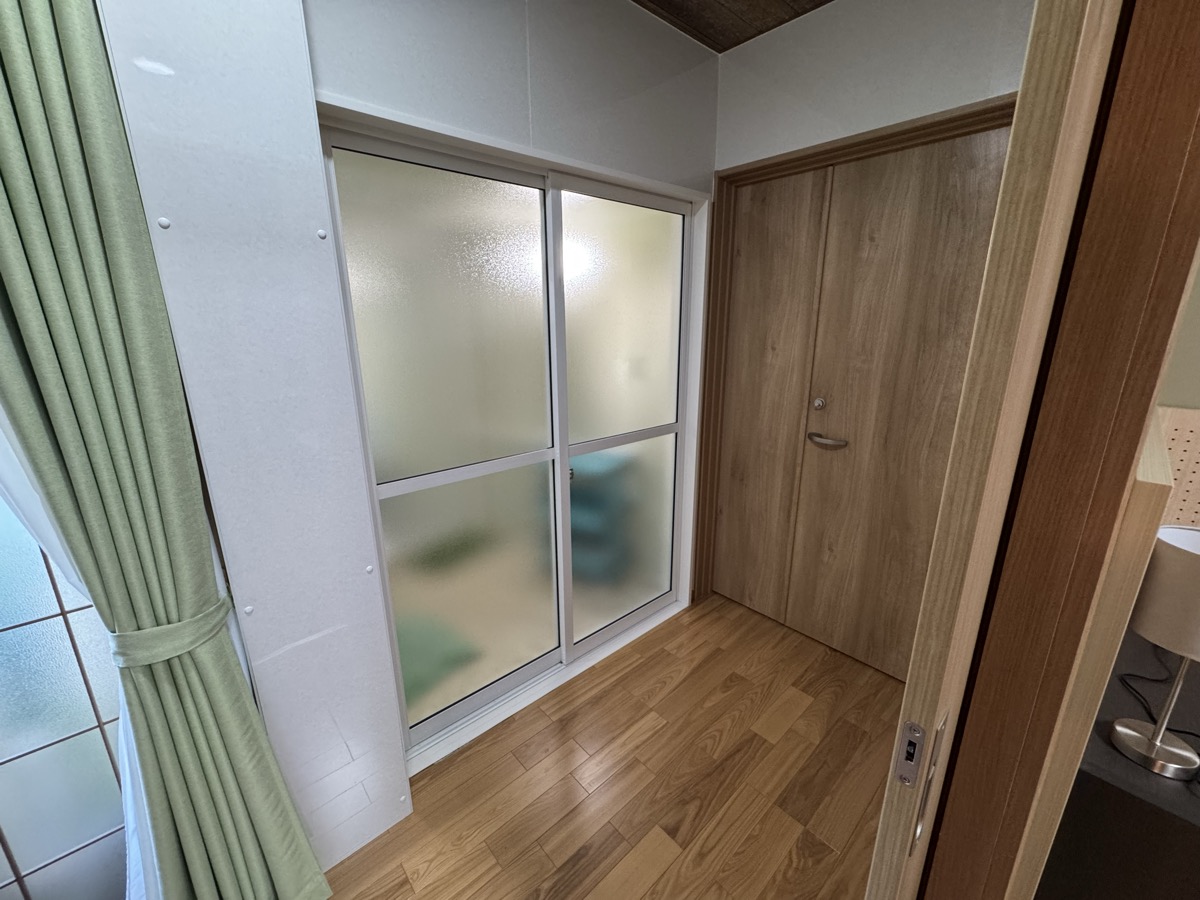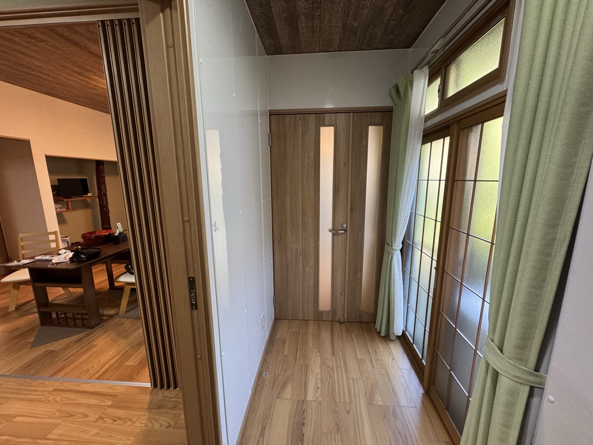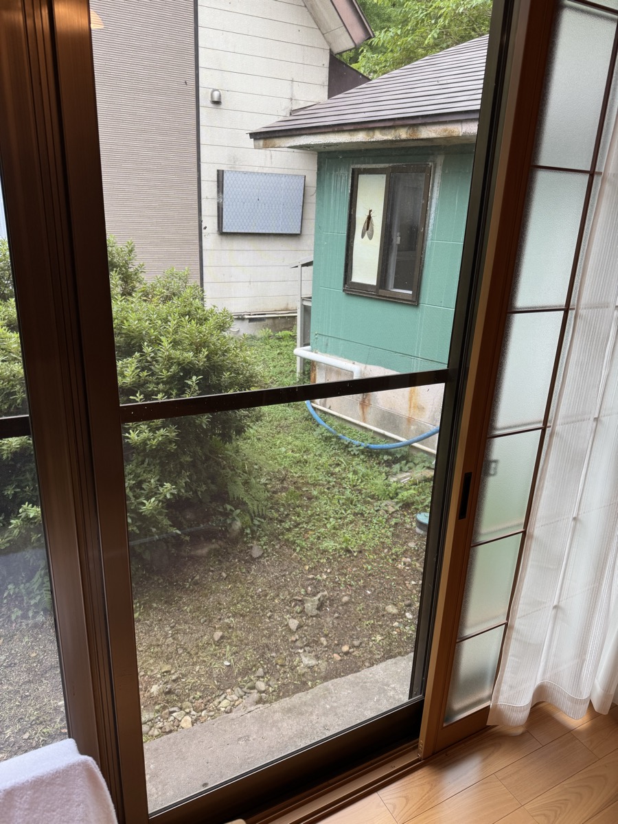 川渡温泉藤島旅館の松8洋室からそろそろチェックアウトしようかと、広縁から右奥の部屋付き風呂(旧家族風呂)をふと見たら、網戸に