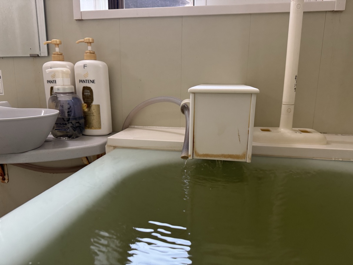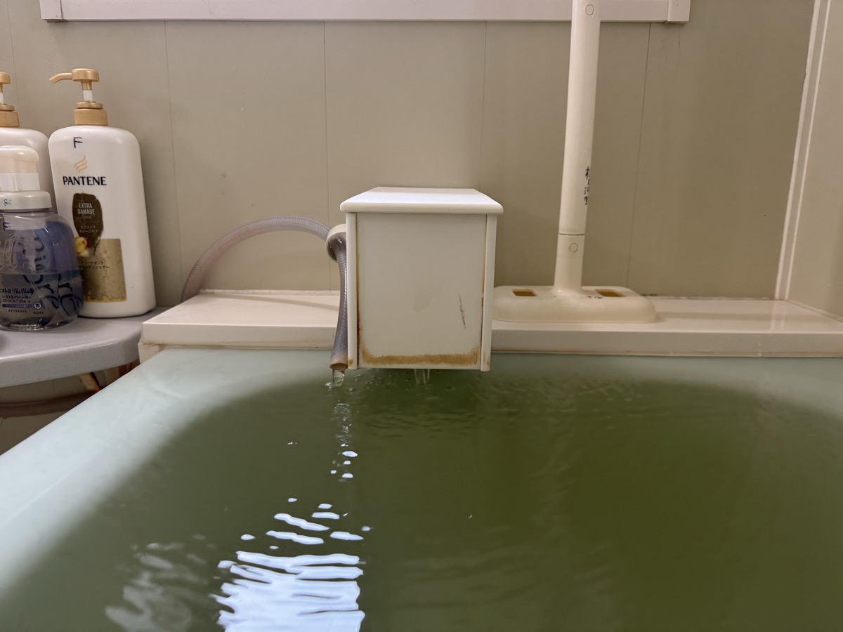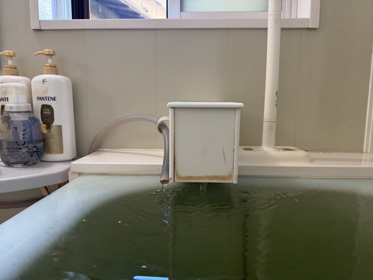 川渡温泉藤島旅館の部屋付き風呂に、いったん強烈に加水をした上で、源泉投入量の2/3くらいの加水量にしたところ、41℃弱の大適温化☆*:.。. o(≧▽≦)o .。.:*☆