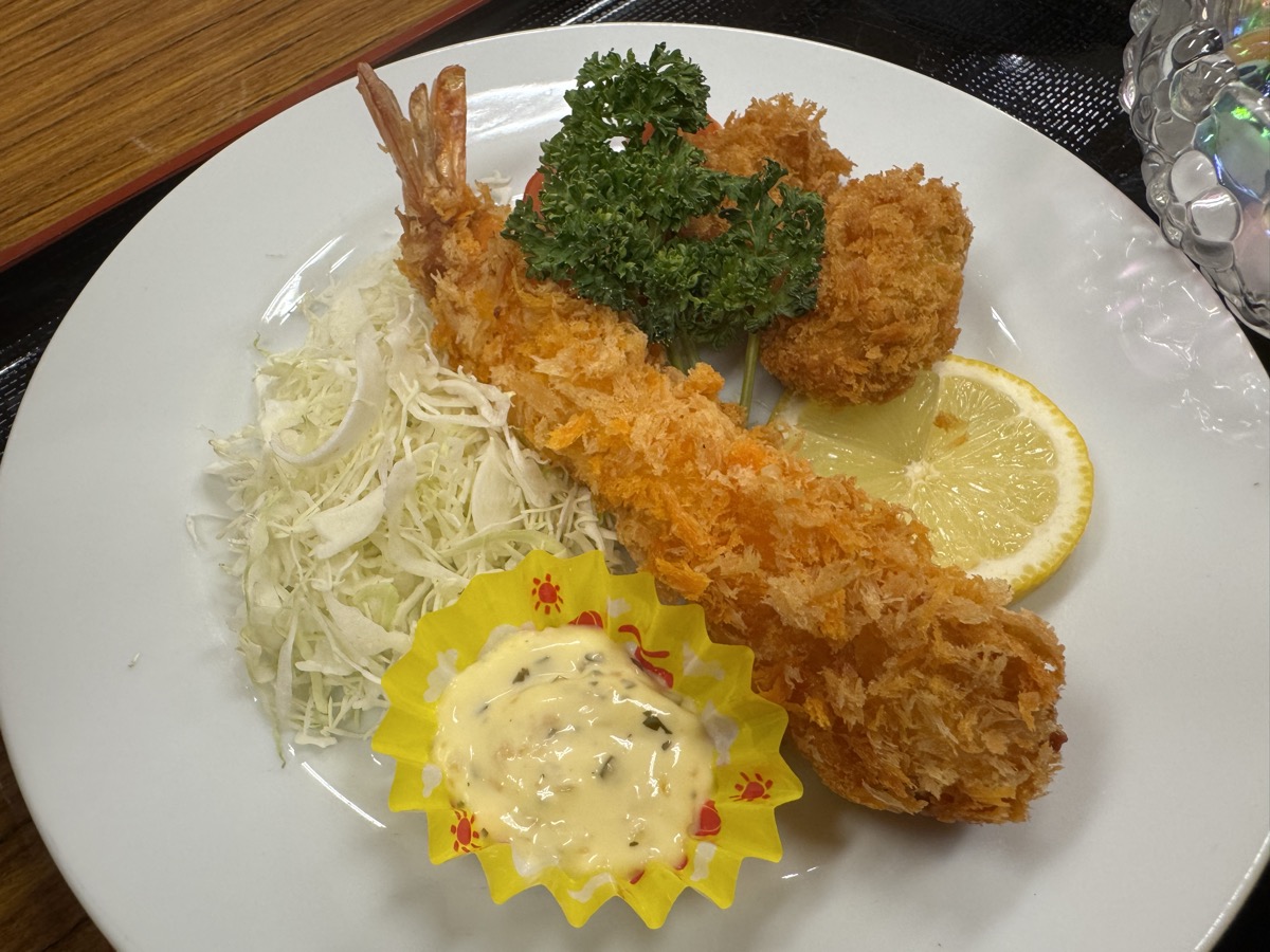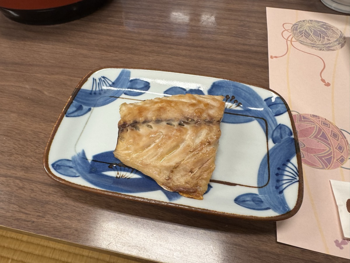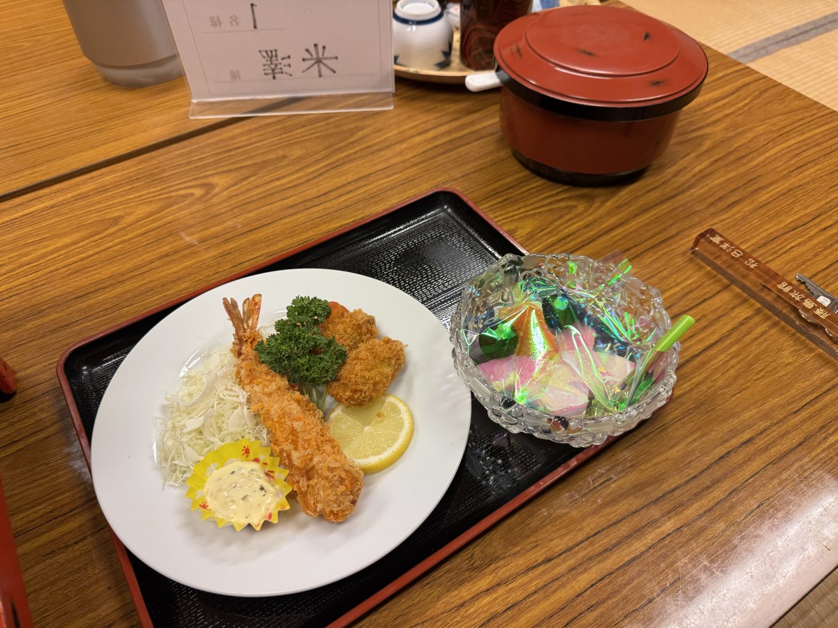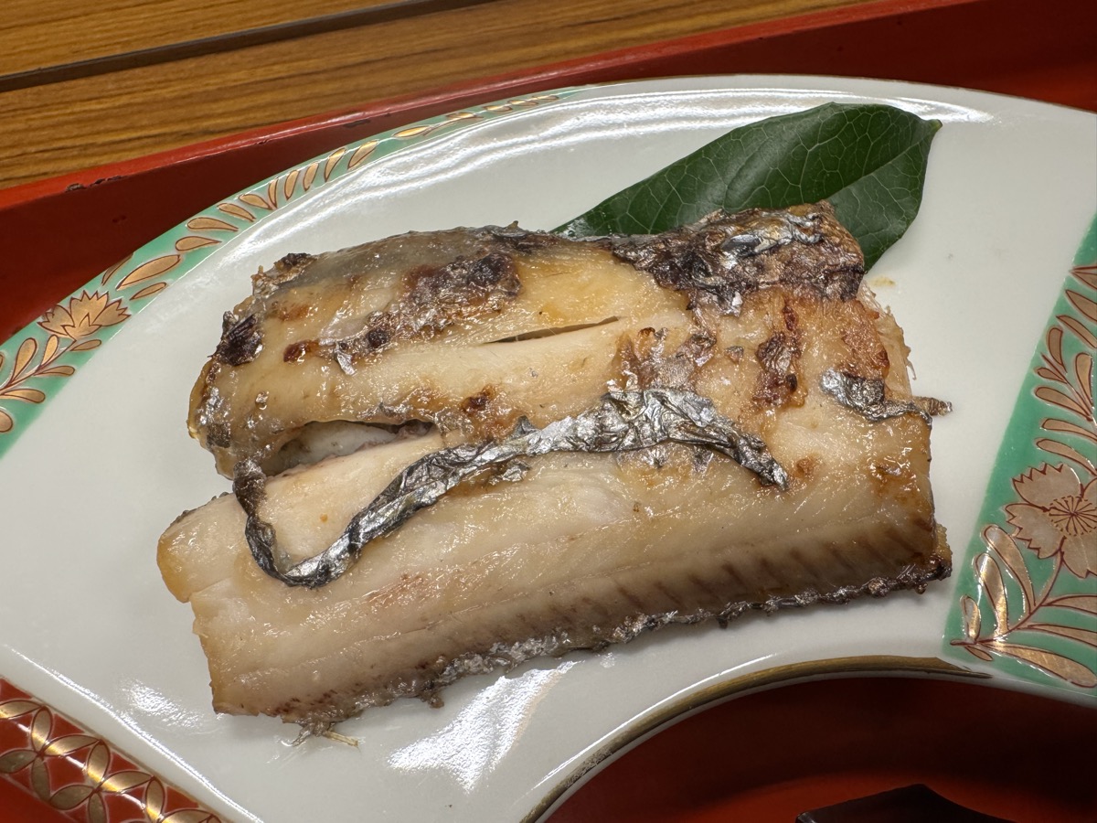 川渡温泉藤島旅館ばんごはんの焼物は子持ちタチウオ?粕漬け、そして冷めてますがカキフリャー&巨大エビフリャー(^○^)