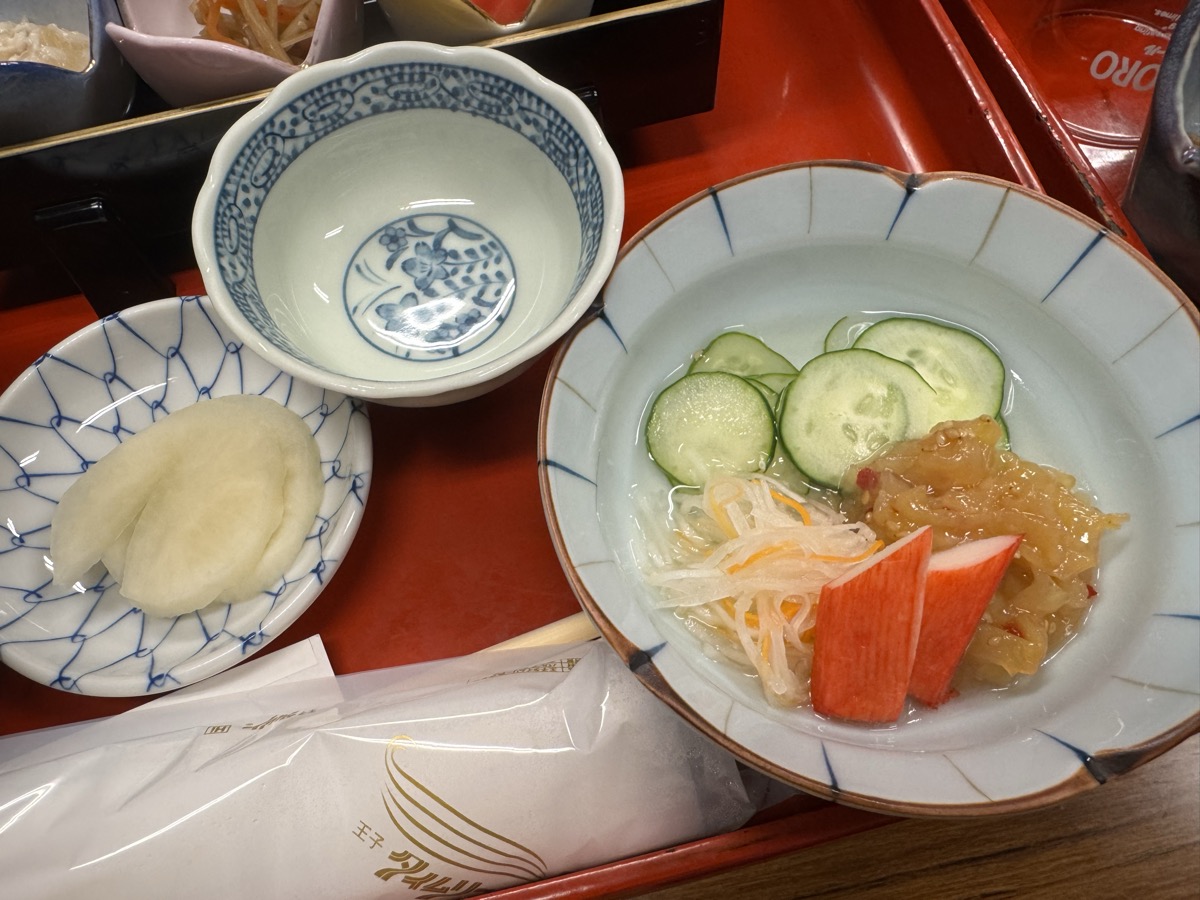 川渡温泉藤島旅館ばんごはん、先付は数の子山葵漬、きんぴら、ベーコントマト。酢の物として中華くらげとカニカマと膾と胡瓜、香の物は大根、そして