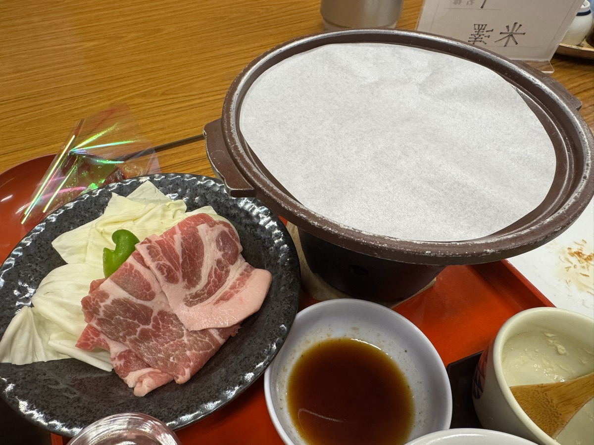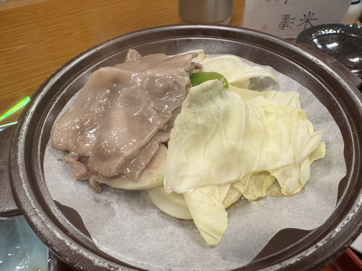 川渡温泉藤島旅館の肉物は豚とキャベツ玉葱ピーマンの陶板蒸し焼き
