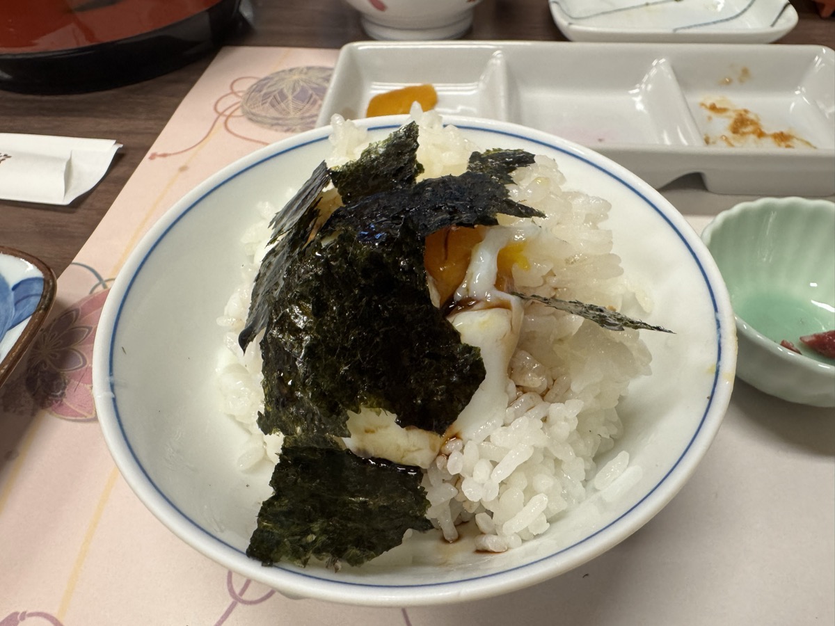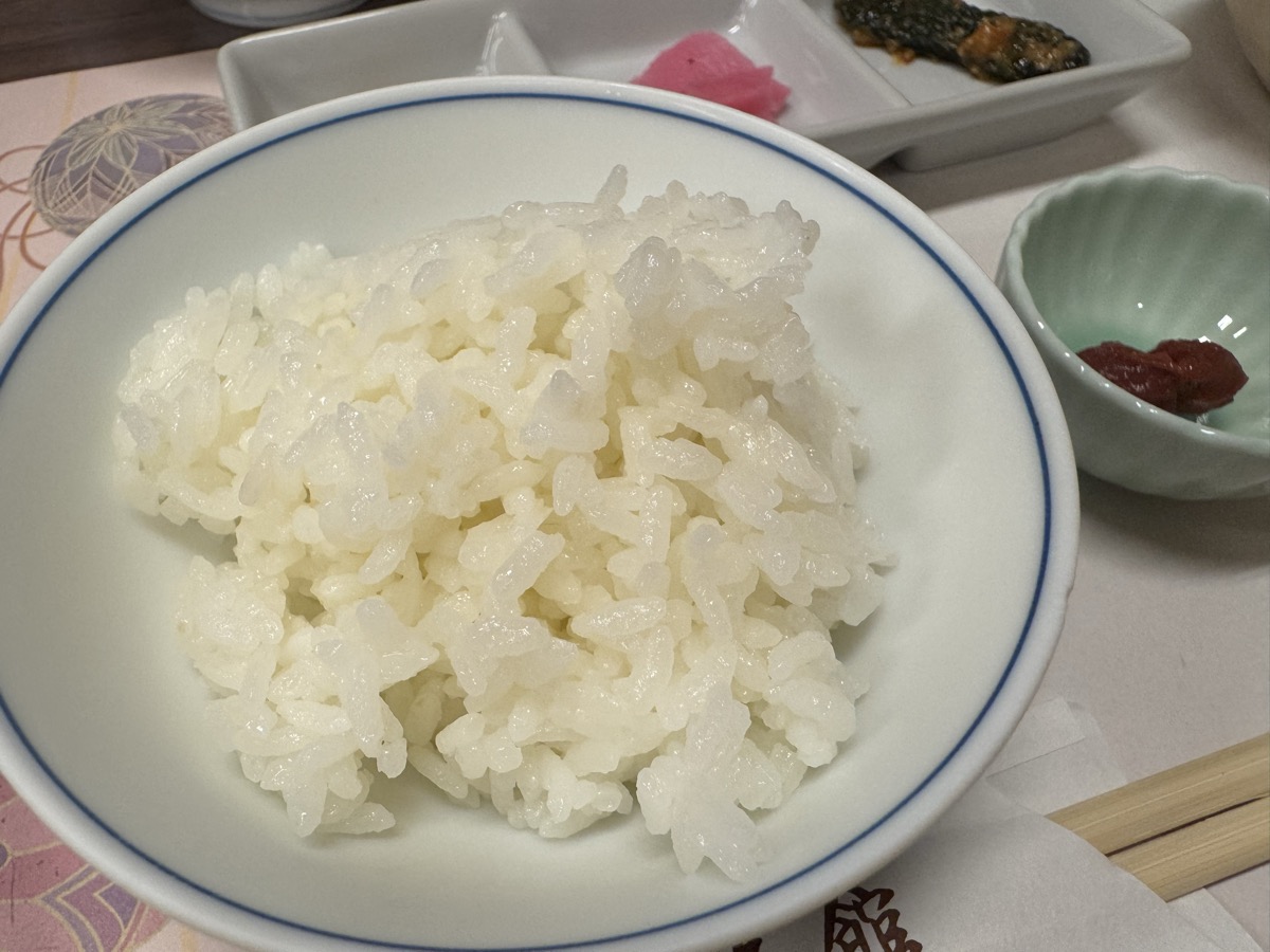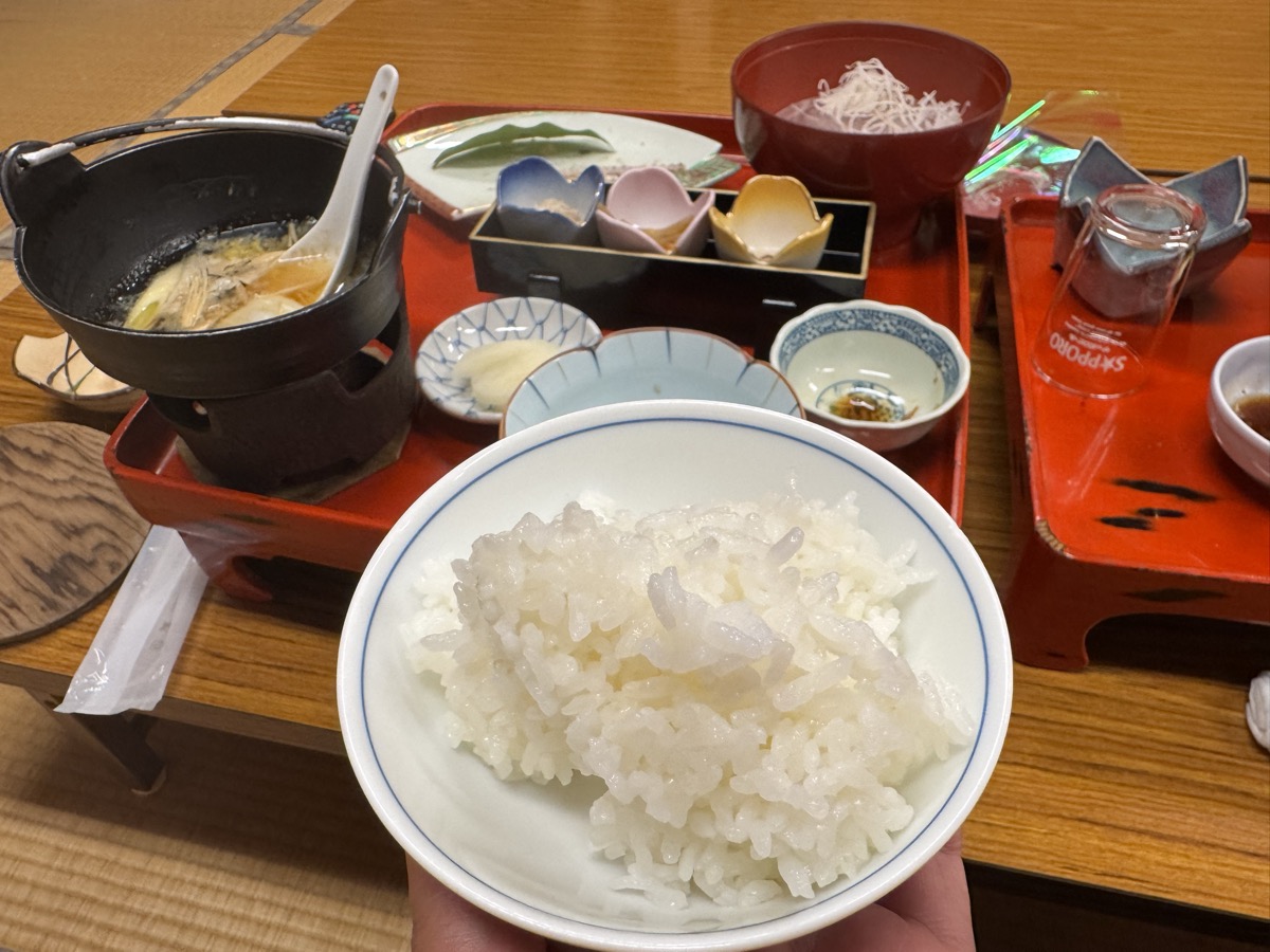 川渡温泉藤島旅館ばんごはん、1時間ですっかり冷めさせてしまったm(_ _)m茶碗3膳ぶんのお櫃ごはん