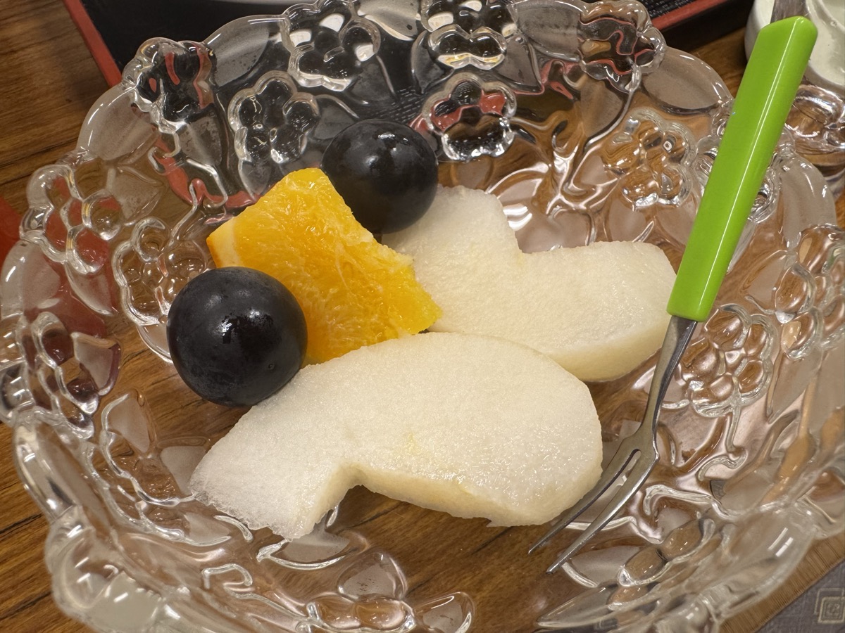 川渡温泉藤島旅館ばんごはんデザートはいずれも甘い梨・葡萄・オレンジを何かの顔型に並べたカワユス♪