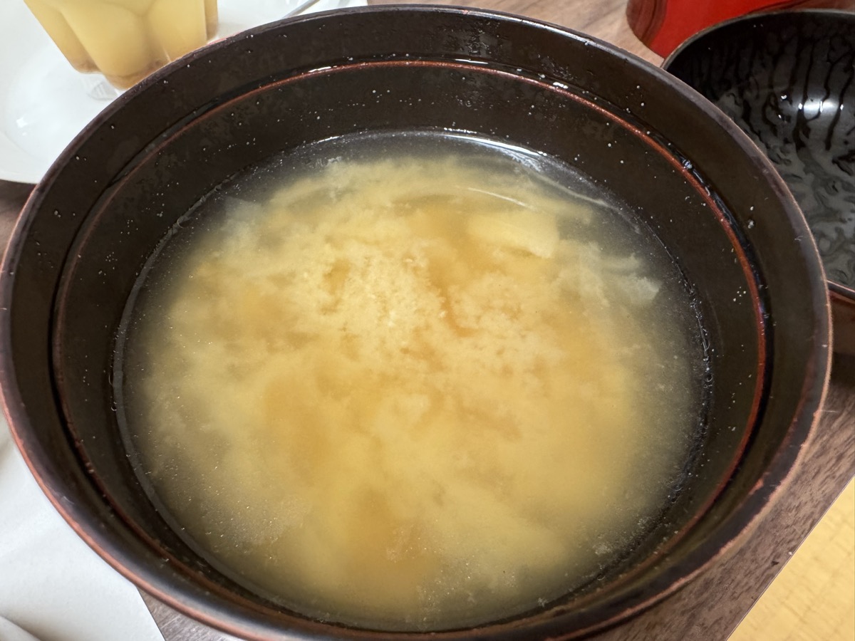 川渡温泉藤島旅館あさごはん、ご飯はお櫃に茶碗ごく軽くの3膳ぶん&味噌汁はじゃがいも玉葱人参油揚げで薄塩のよねざわ好み(^_?)?☆