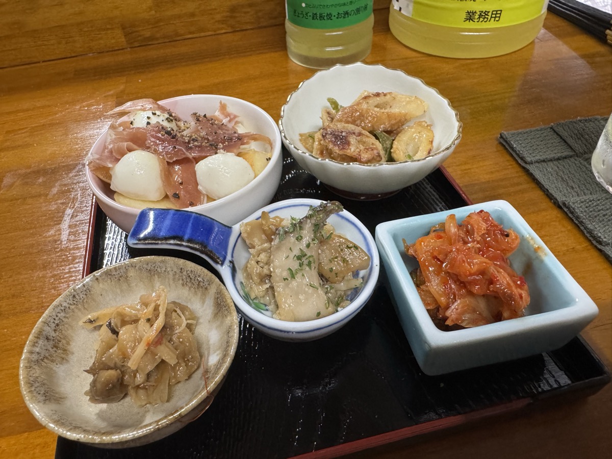 本日の鳴子温泉菅原分店765の ちょい食べセットは、アミキムチ、きのこのガーリックソテー、梅なめ茸茄子和え、桃モッツァレラ、ちくわとピーマンのマヨ炒め胡麻和え!