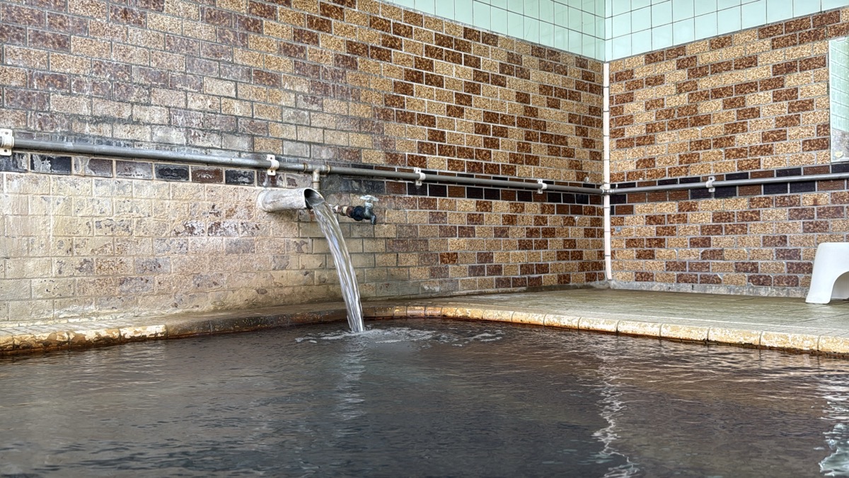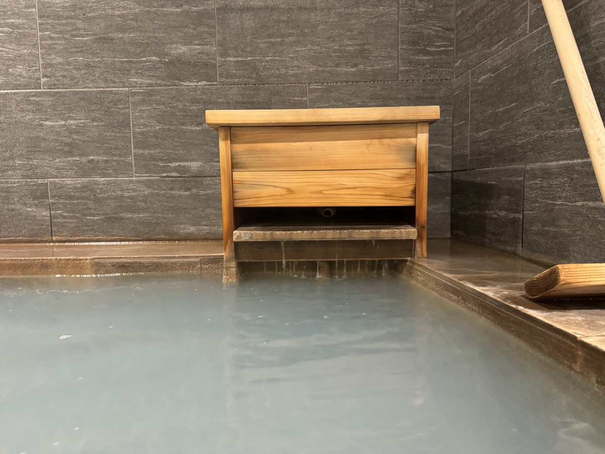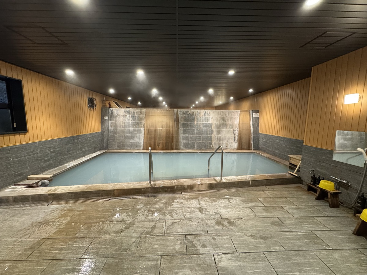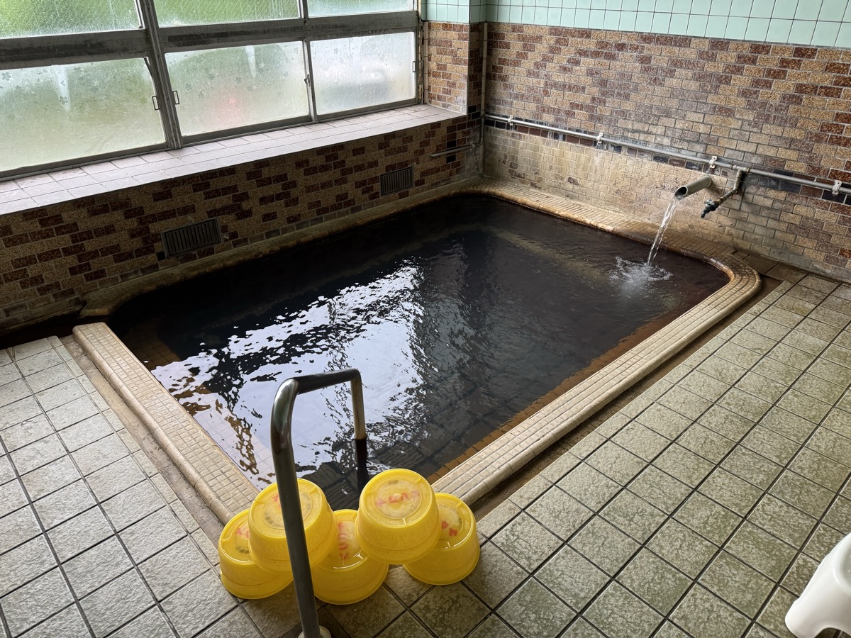 鳴子温泉旅館すがわらに戻り、戦時疎開のこどもたちを文字どおりの芋洗いするために造られた1階家族風呂、の右側小さい方に浸かりましょう