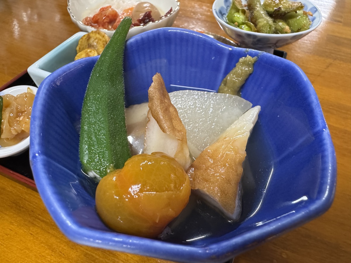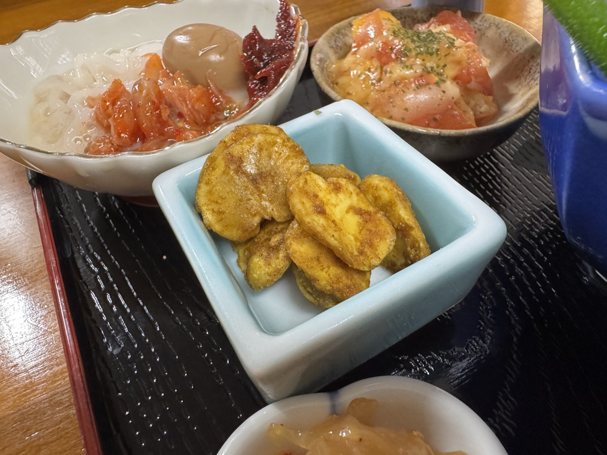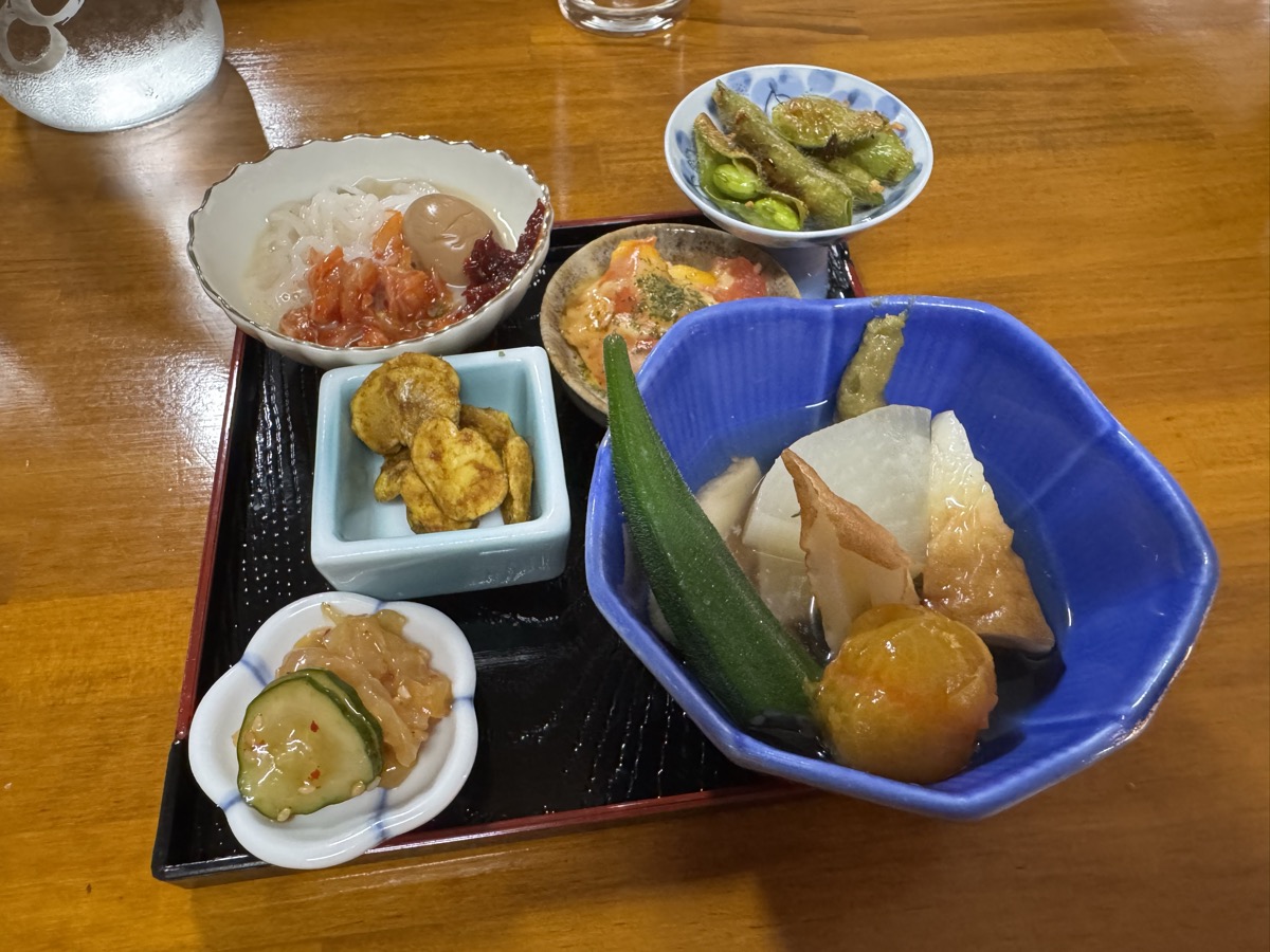 本日の鳴子温泉菅原分店の ちょい食べセット、冷しおでん、中華クラゲ、新潟カレー豆、豆腐そうめん冷麺風、トマトチーズ焼、枝豆ペペロンチーノ