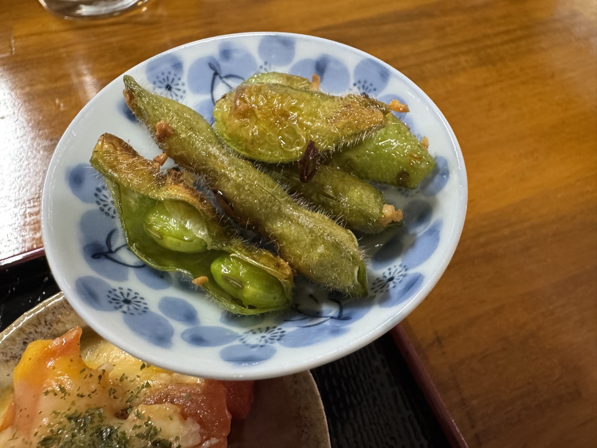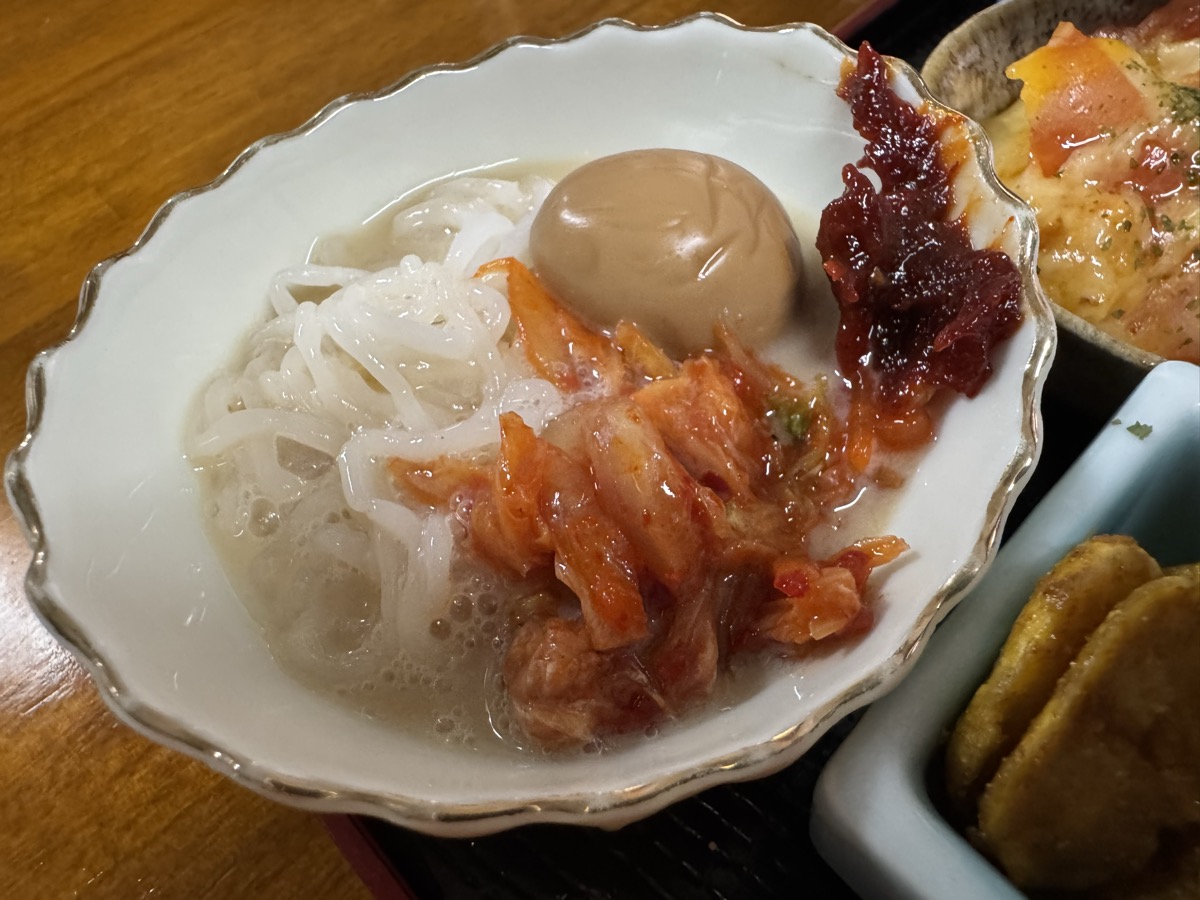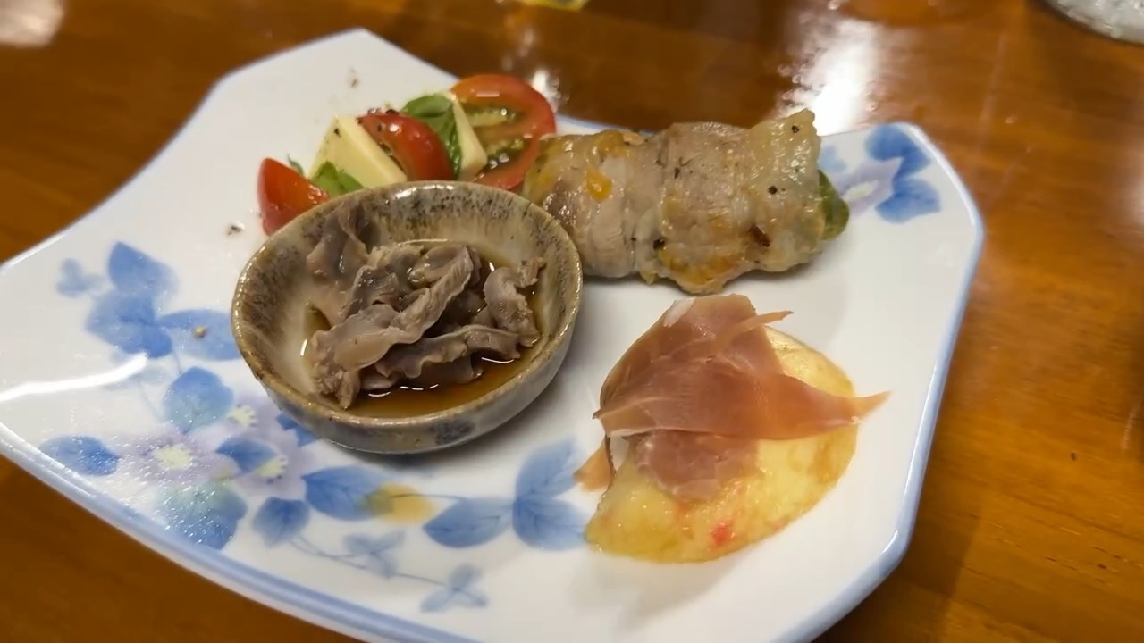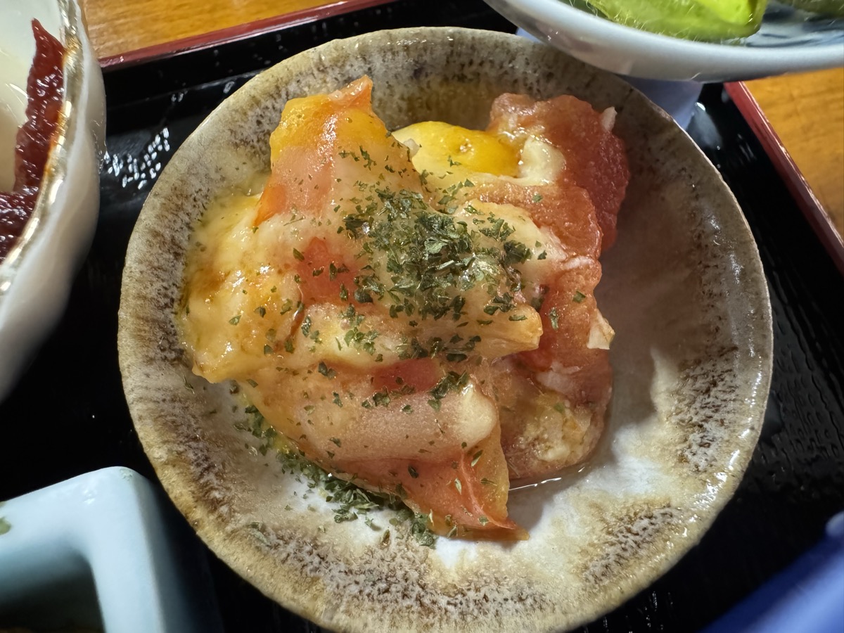 本日の鳴子温泉菅原分店の ちょい食べセット、冷しおでん、中華クラゲ、新潟カレー豆、豆腐そうめん冷麺風、トマトチーズ焼、枝豆ペペロンチーノ
