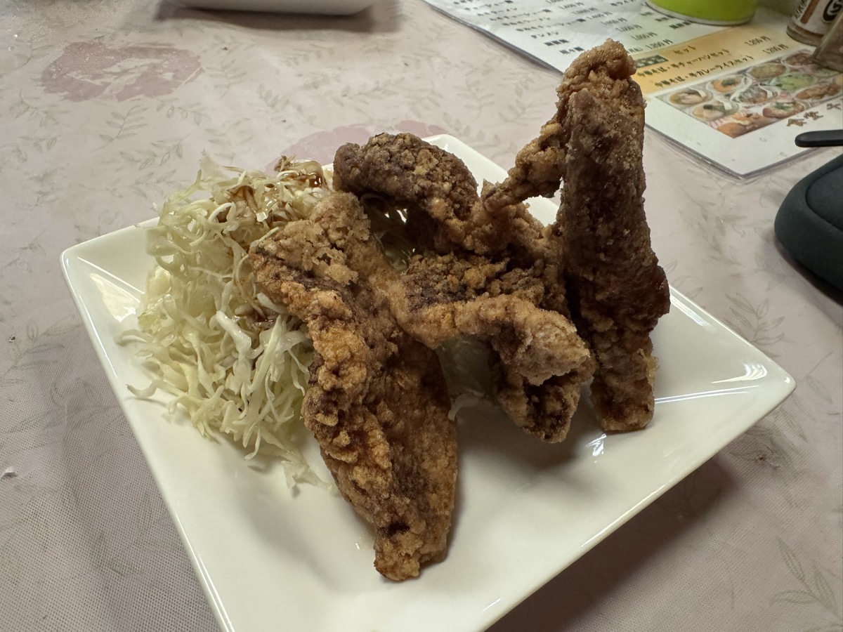 東鳴子温泉食堂千両でレモンサワー2杯め( ^ ^ )/□ とともにサービスアテその2、毎度おなじみ豚唐揚げの揚げたて!(((o(*゚▽゚*)o)))