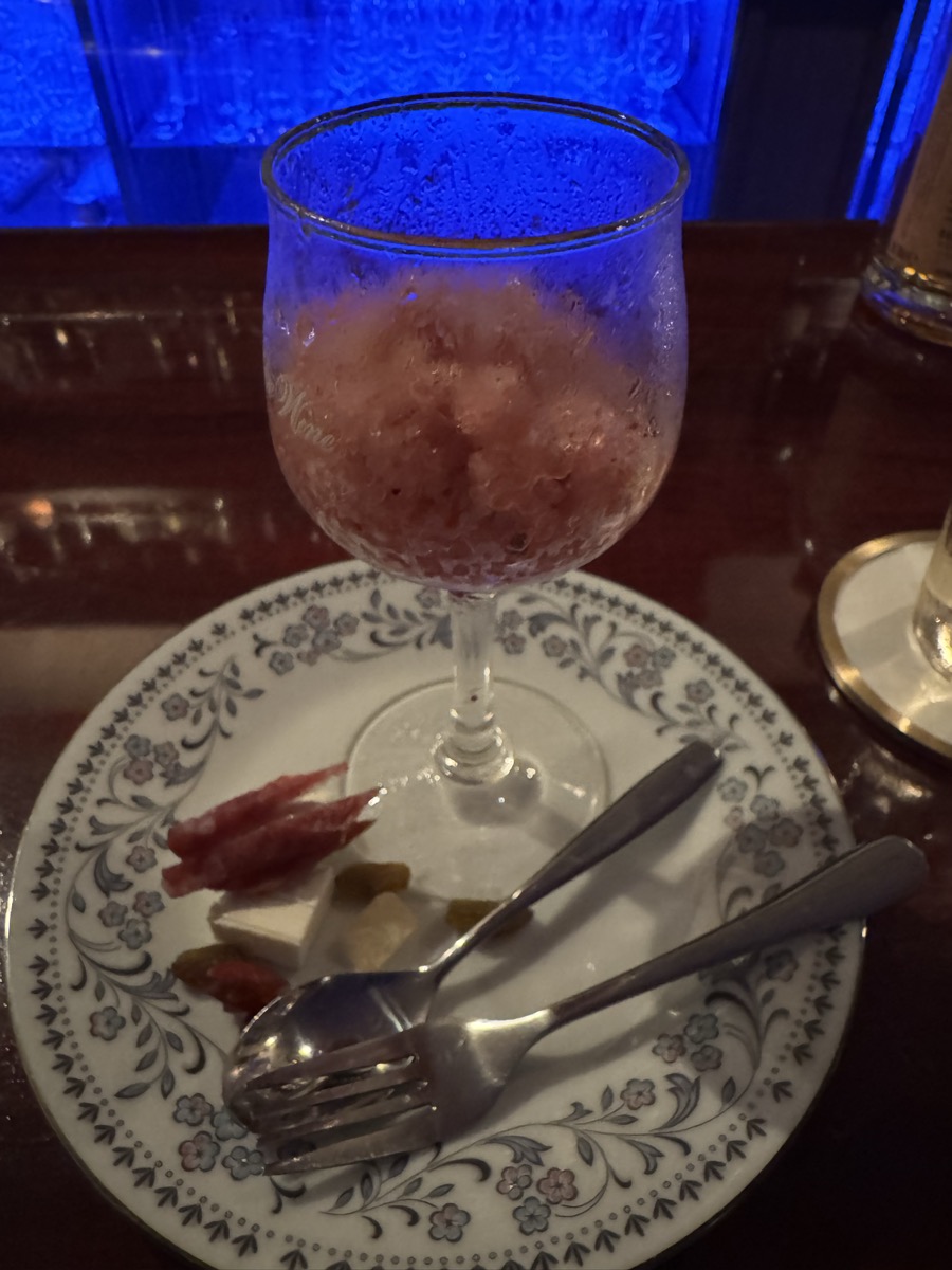 鳴子温泉オーセンティックバー ルドルフのフードはスイカのソルベヽ(´▽`)/ そしてサービスでバランタインの70年代ボトルをひとくちいただきましたm(__)m