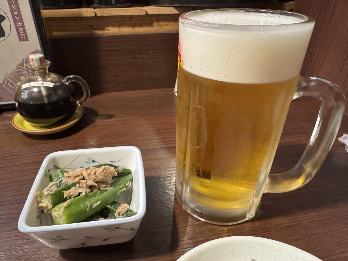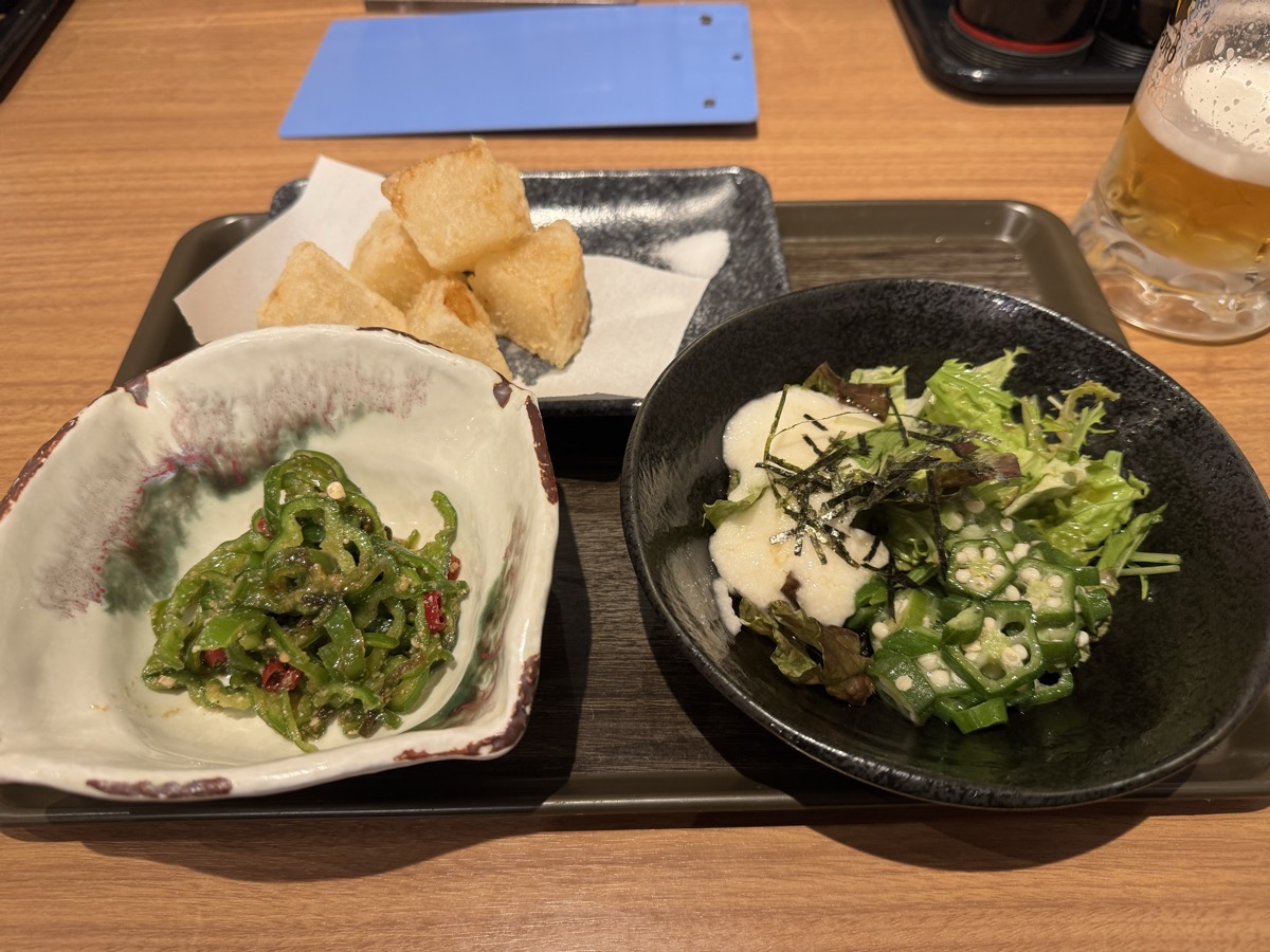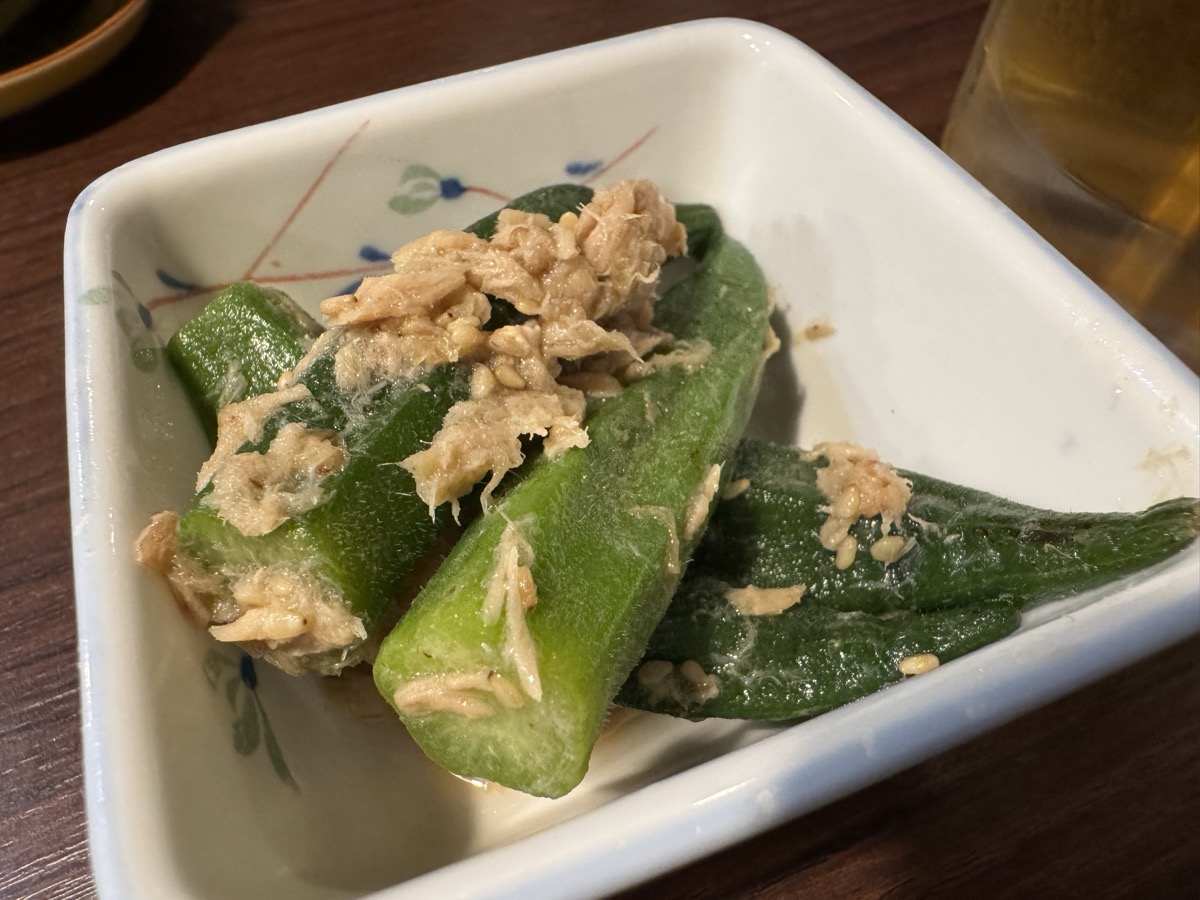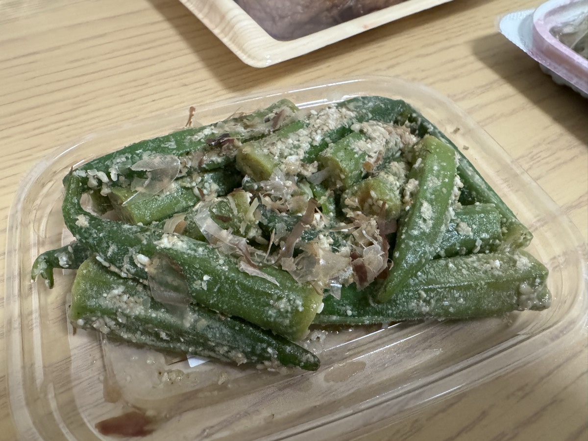 吉松駅前温泉湯の宿ゆうすいでのエーコープ吉松店調達の部屋呑みのアテ、オクラのごま和え&鹿児島県産きびなごの南蛮漬け!