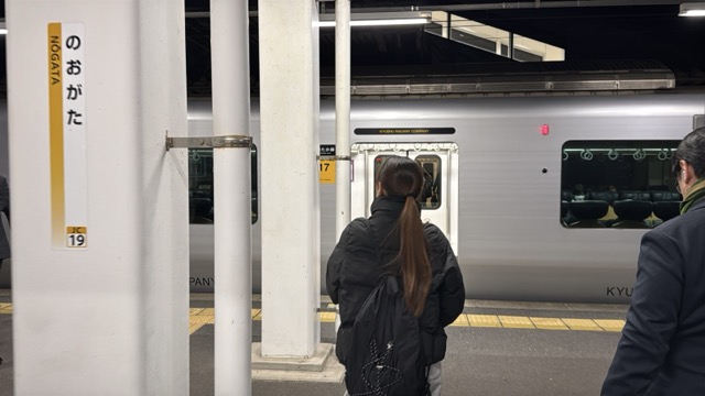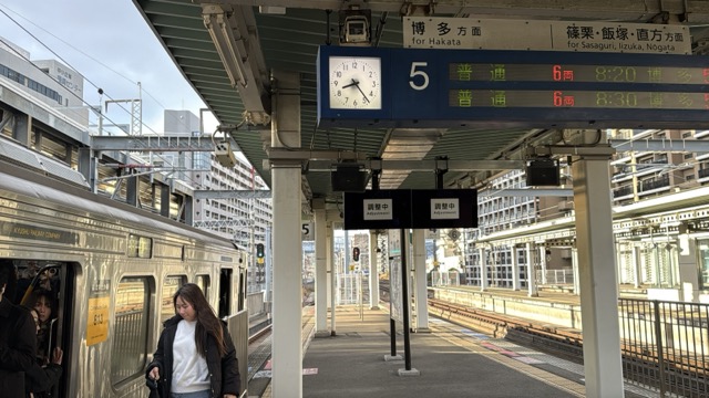 1分遅着の終点直方駅で九州島内最長O型きっぷの旅9経路め「筑豊東水巻」継続、始発快速博多行きに同一ホーム2分差乗り継ぎして
