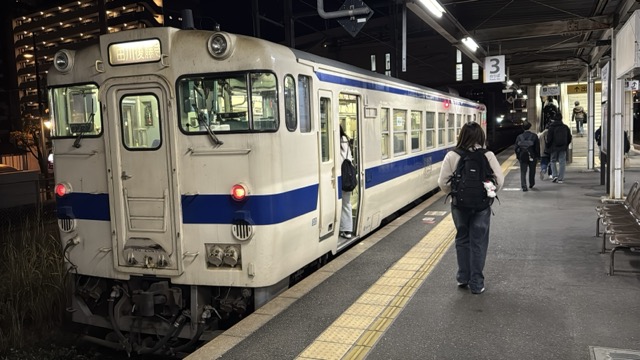 夜になりまして九州島内最長O型きっぷの旅再開、宮崎駅に再入場して日豊本線普通都城行きに乗車