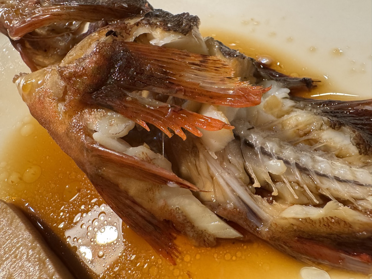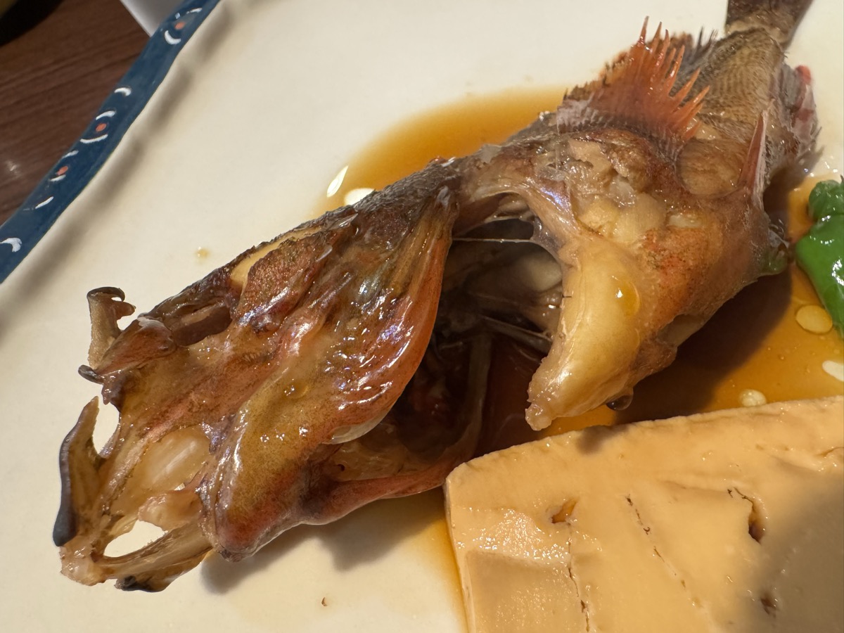 先生! 褒めてください!! ろばた仁 竹瓦横丁店の赤ホゴ(アカハタ)煮付、頭から背骨から尾鰭まで完全完食しました!!!\(^ω^)/