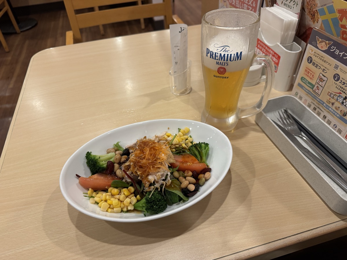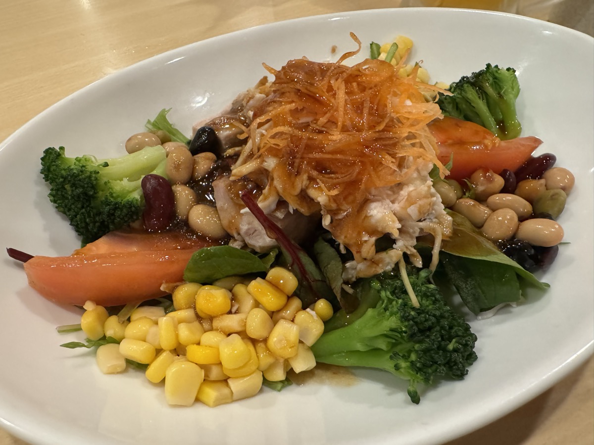 ジョイフル都城店で「たんぱく質が摂れる!蒸し豆とグリルチキンのお食事サラダ」812円
