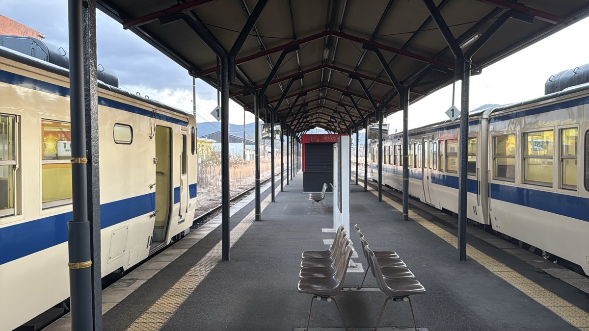 新飯塚駅から九州島内最長O型きっぷの旅10経路め、後藤寺線始発普通田川後藤寺行きに同一ホーム11分差乗り継ぎお