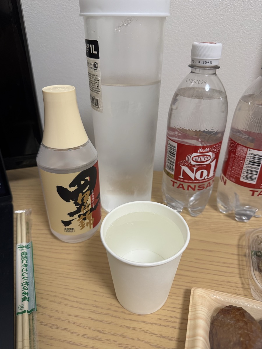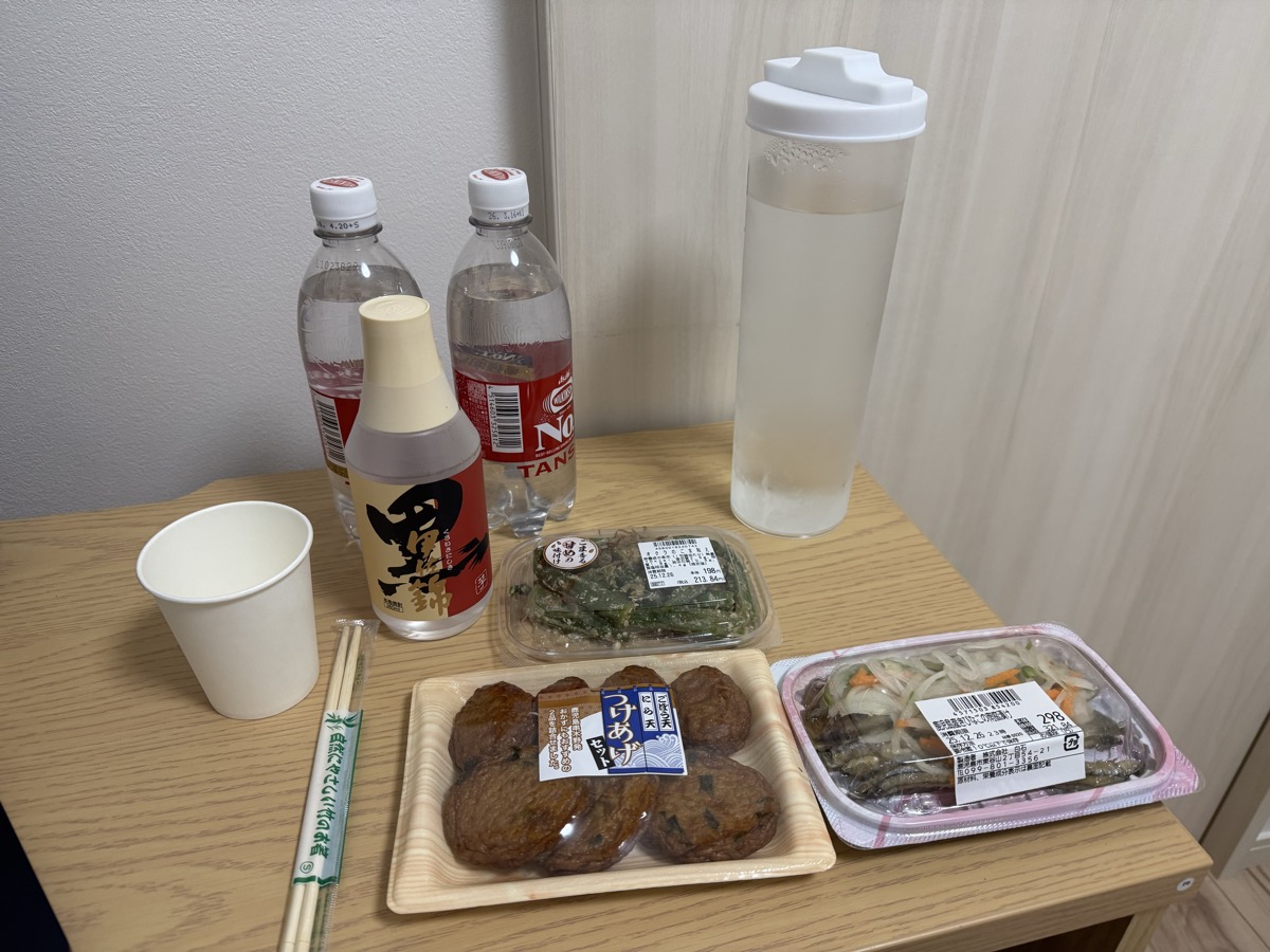 吉松駅前温泉 湯の宿ゆうすい の自室に戻りテーブルに展開、鹿児島ではよく見かけるけど県外では見ない2合ペット芋、今回は黒伊佐錦にしまして、
